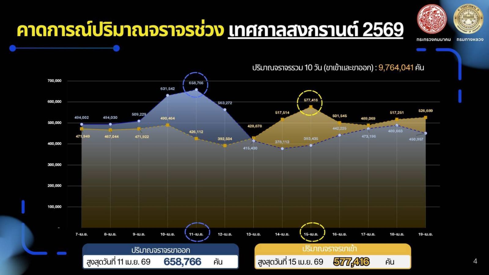 ทั้งนี้ กรมทางหลวงได้คาดการณ์ว่าในช่วงเทศกาลสงกรานต์ 2569 จะมีปริมาณจราจรเข้า-ออกกรุงเทพมหานคร รวมทั้งสิ้น 9,764,041 คัน โดยคาดว่าประชาชนจะเริ่มทยอยเดินทางออกตั้งแต่ช่วงเย็นของวันที่ 10 เม.ย. 69 ส่วนขากลับคาดว่าจะเริ่มทยอยเดินทางกลับตั้งแต่วันที 14 เม.ย. 69 พร้อมขอความร่วมมือประชาชนผู้ใช้ทางวางแผนการเดินทางล่วงหน้า ตรวจสอบสภาพรถให้พร้อมใช้งาน เพื่อความสะดวก รวดเร็ว และปลอดภัยในการเดินทาง