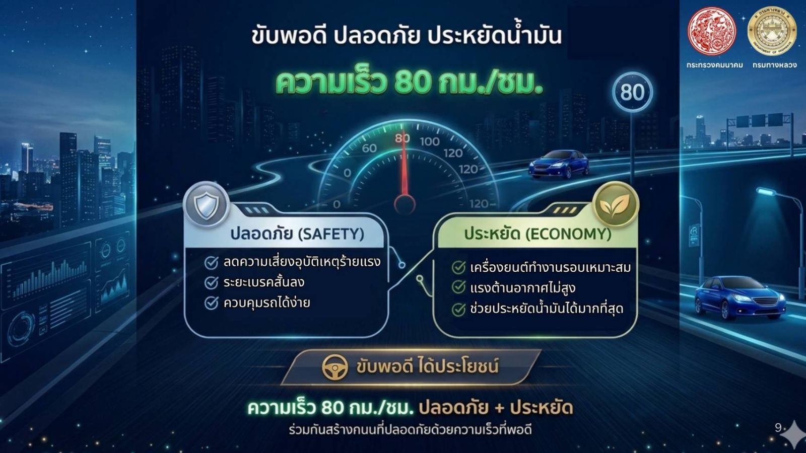 นอกจากนี้กรมทางหลวงได้รณรงค์ให้ประชาชนขับขี่อย่างปลอดภัยควบคู่กับการประหยัดพลังงาน โดยขอความร่วมมือใช้ความเร็วไม่เกิน 80 กิโลเมตรต่อชั่วโมง เพื่อลดความเสี่ยงในการเกิดอุบัติเหตุและช่วยลดการใช้พลังงานในภาพรวมของประเทศ