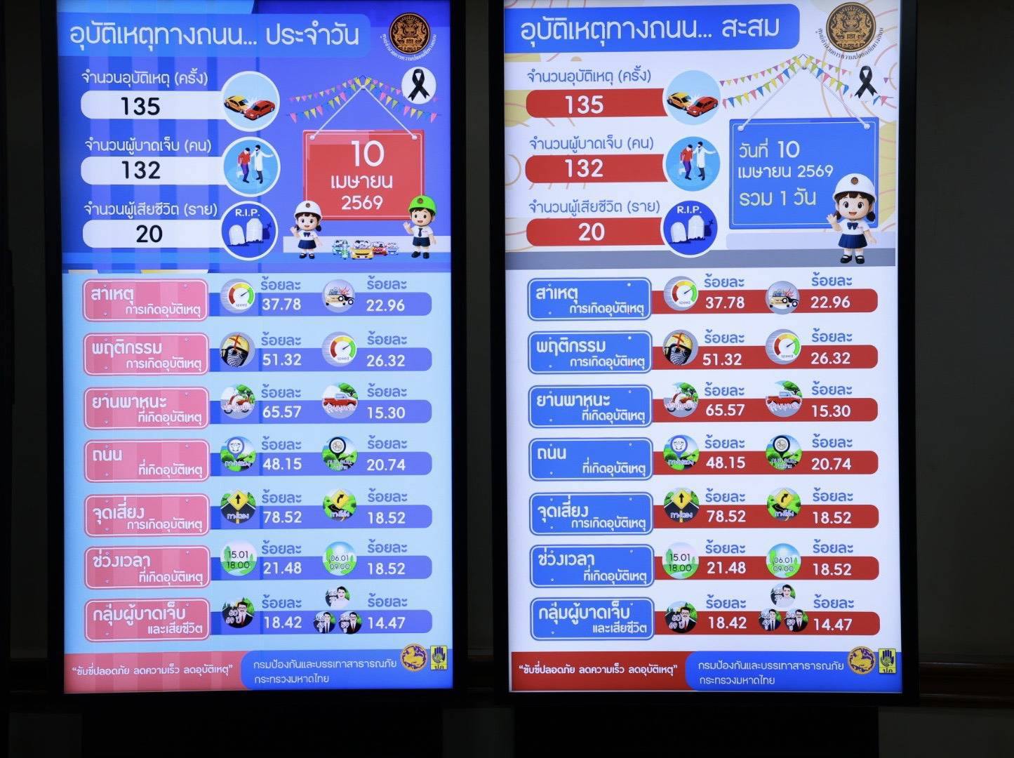 พล.ต.อ.สำราญ นวลมา รองผู้บัญชาการตำรวจแห่งชาติ ในฐานะประธานแถลงข่าวสรุปผลการดำเนินงานของศูนย์อำนวยการป้องกันและลดอุบัติเหตุทางช่วงเทศกาลสงกรานต์ พ.ศ. 2569 เปิดเผยว่า ศูนย์อำนวยการป้องกันและลดอุบัติเหตุทางถนนช่วงเทศกาลสงกรานต์ พ.ศ. 2569 โดยกรมป้องกันและบรรเทาสาธารณภัยและความร่วมมือของภาคีเครือข่ายได้รวบรวมสถิติอุบัติเหตุทางถนน ประจำวันที่ 10 เมษายน 2569 ซึ่งเป็นวันแรกของการรณรงค์ “ขับขี่ปลอดภัย ลดความเร็ว ลดอุบัติเหตุ” เกิดอุบัติเหตุ 135 ครั้ง ผู้บาดเจ็บ 132 คน ผู้เสียชีวิต 20 ราย สาเหตุที่ทำให้เกิดอุบัติเหตุสูงสุด ได้แก่ ขับรถเร็ว ร้อยละ 37.78 ตัดหน้ากระชั้นชิด ร้อยละ 22.96 ยานพาหนะที่เกิดอุบัติเหตุสูงสุด ได้แก่ รถจักรยานยนต์ ร้อยละ 70.49 ส่วนใหญ่เกิดบนเส้นทางตรง ร้อยละ 78.52 ถนนกรมทางหลวง ร้อยละ 48.15 ถนนใน อบต./หมู่บ้าน ร้อยละ 20.74 ช่วงเวลาที่เกิดอุบัติเหตุสูงสุด ได้แก่ ช่วงเวลา 15.01 – 18.00 น. ร้อยละ 21.48 ผู้บาดเจ็บและเสียชีวิตสูงสุดอยู่ในช่วงอายุ 60 - 69 ปี ร้อยละ 18.42 โดยจังหวัดที่เกิดอุบัติเหตุสูงสุด ได้แก่ ตรัง และสงขลา (จังหวัดละ 8 ครั้ง) จังหวัดที่มีผู้บาดเจ็บสูงสุด ได้แก่ ตรัง (9 คน) จังหวัดที่มีผู้เสียชีวิตสูงสุด ได้แก่ ปราจีนบุรี และสงขลา (จังหวัดละ 2 ราย) จังหวัด ที่ไม่มีผู้เสียชีวิต (ตายเป็นศูนย์) มี 59 จังหวัด