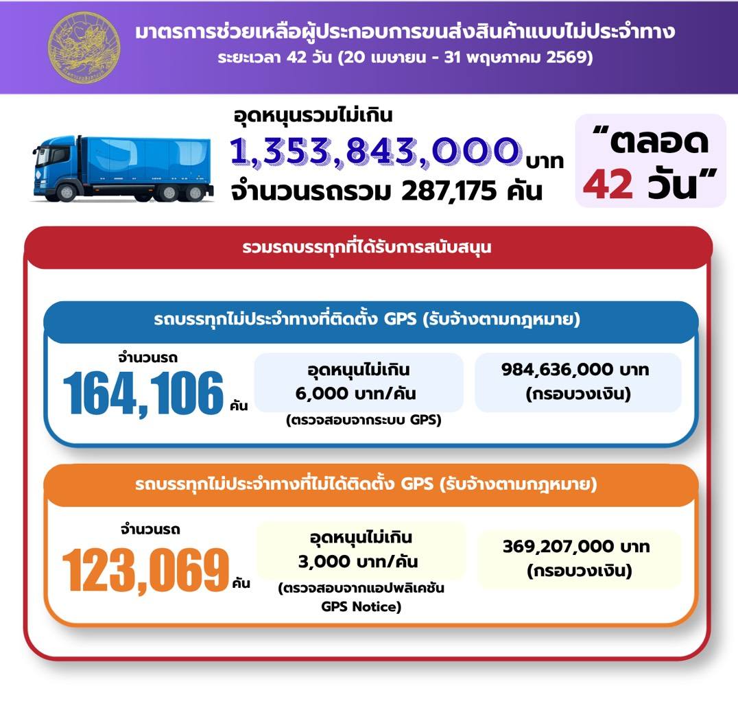อธิบดีกรมการขนส่งทางบก กล่าวอีกว่า สำหรับกลุ่มผู้ประกอบการขนส่งและผู้ขับรถที่เข้าข่ายได้รับการช่วยเหลือ กรมการขนส่งทางบก จะเปิดให้ลงทะเบียนรับสิทธิ์ระหว่างวันที่ 16-19 เม.ย.2569 โดยจะจ่ายเงินช่วยเหลือผ่านระบบ PromptPay เพื่อช่วยเหลือผู้ประกอบการขนส่ง ในการเดินรถตลอดระยะเวลา 42 วัน (20 เม.ย.-31 พ.ค.2569