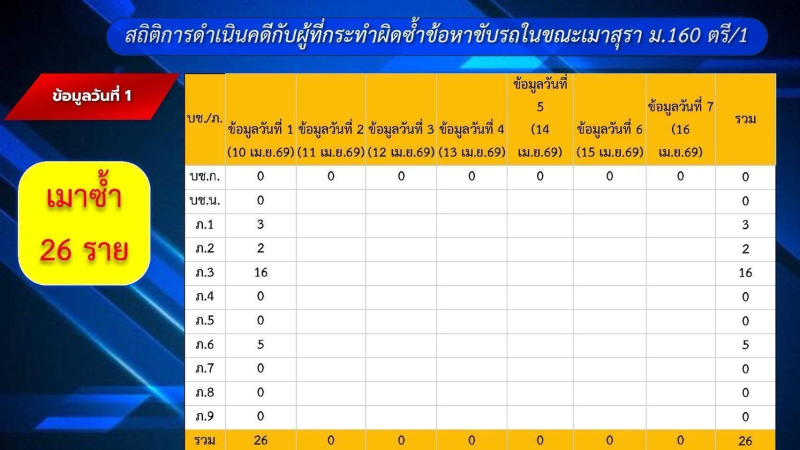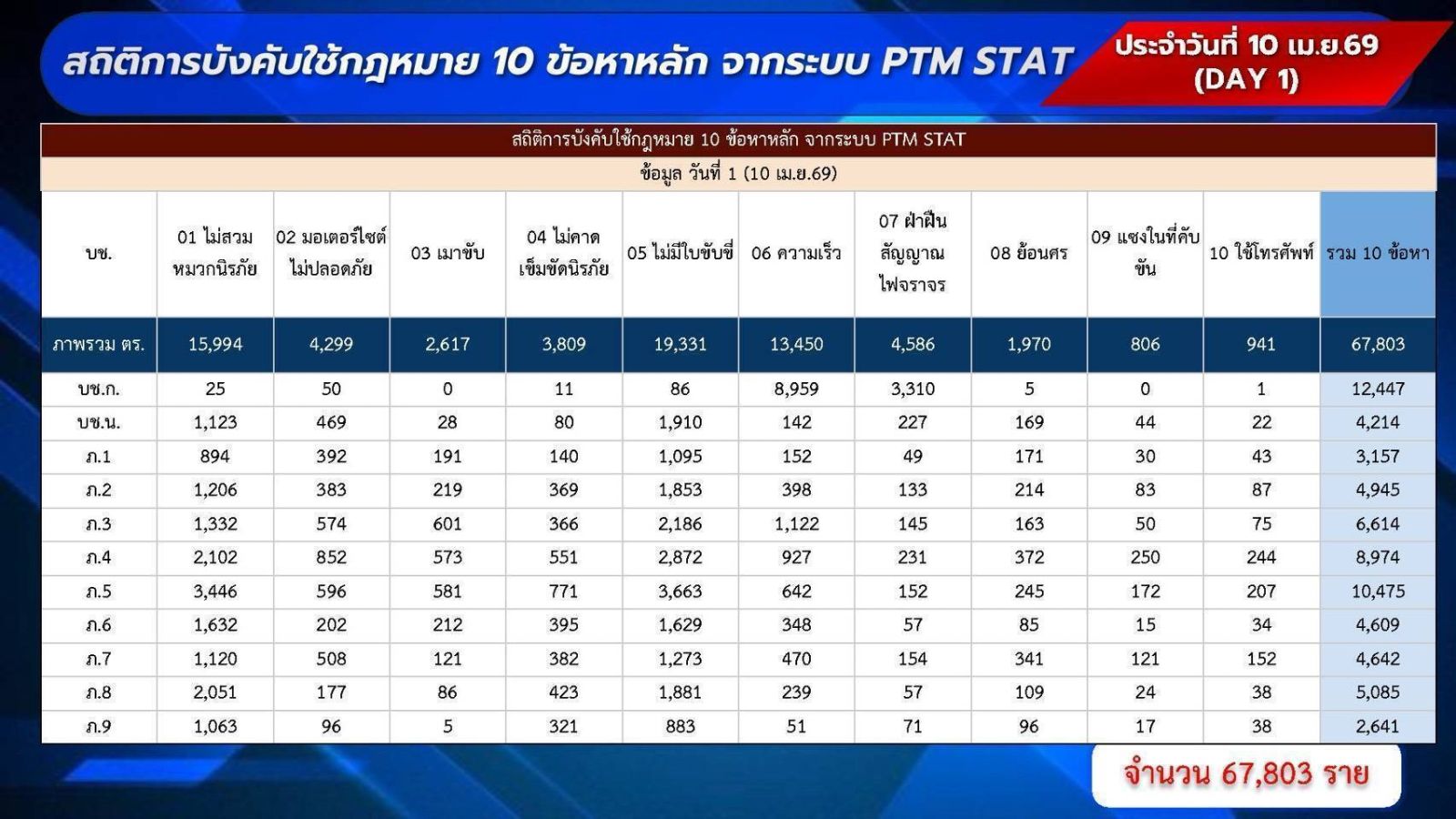 โดยในวันที่ 10 เมษายน 2569 มีการดำเนินคดี “เมาแล้วขับ” จำนวน 2,617 ราย ในจำนวนมีตรวจพบว่าเป็นผู้ที่กระทำความผิดซ้ำ จำนวน 26 ราย ซึ่งจะต้องถูกส่งฟ้องต่อศาลและมีอัตราโทษสูงขึ้นตามที่กฎหมายได้กำหนด นอกจากนี้ สถิติการบังคับใช้กฎหมายใน 10 ข้อหาหลัก (10 รสขม) รวมทั้งสิ้น 67,803 ราย โดย 3 อันดับความผิดสูงสุด ได้แก่ ไม่สวมหมวกนิรภัย 15,994 ราย, ขับรถเร็ว 13,450 ราย และไม่รัดเข็มขัดนิรภัย 3,809 ราย