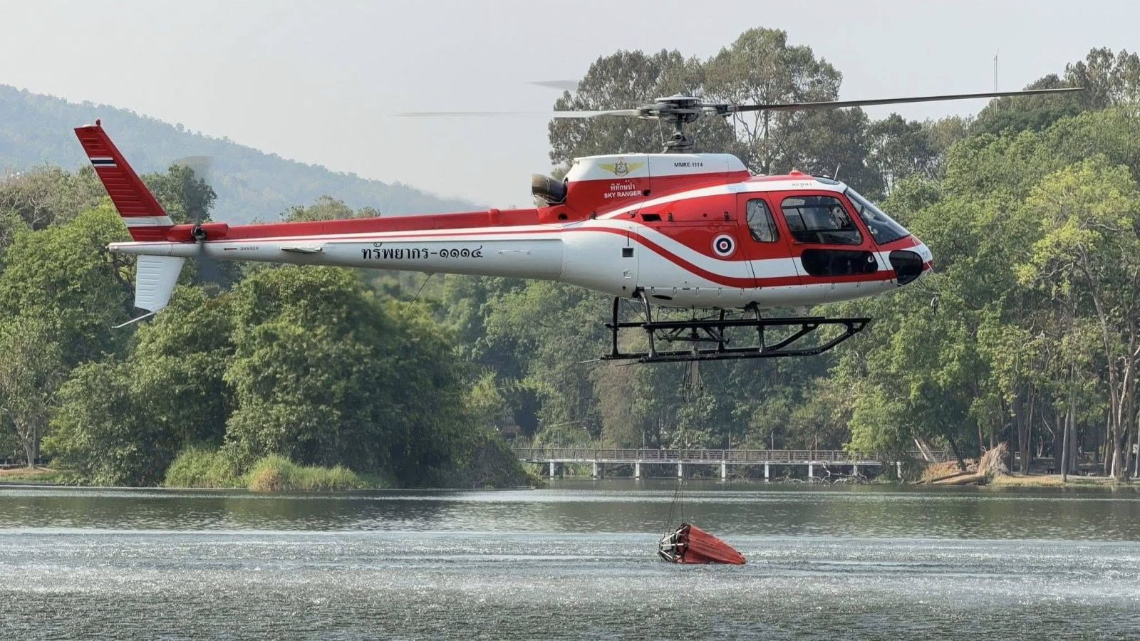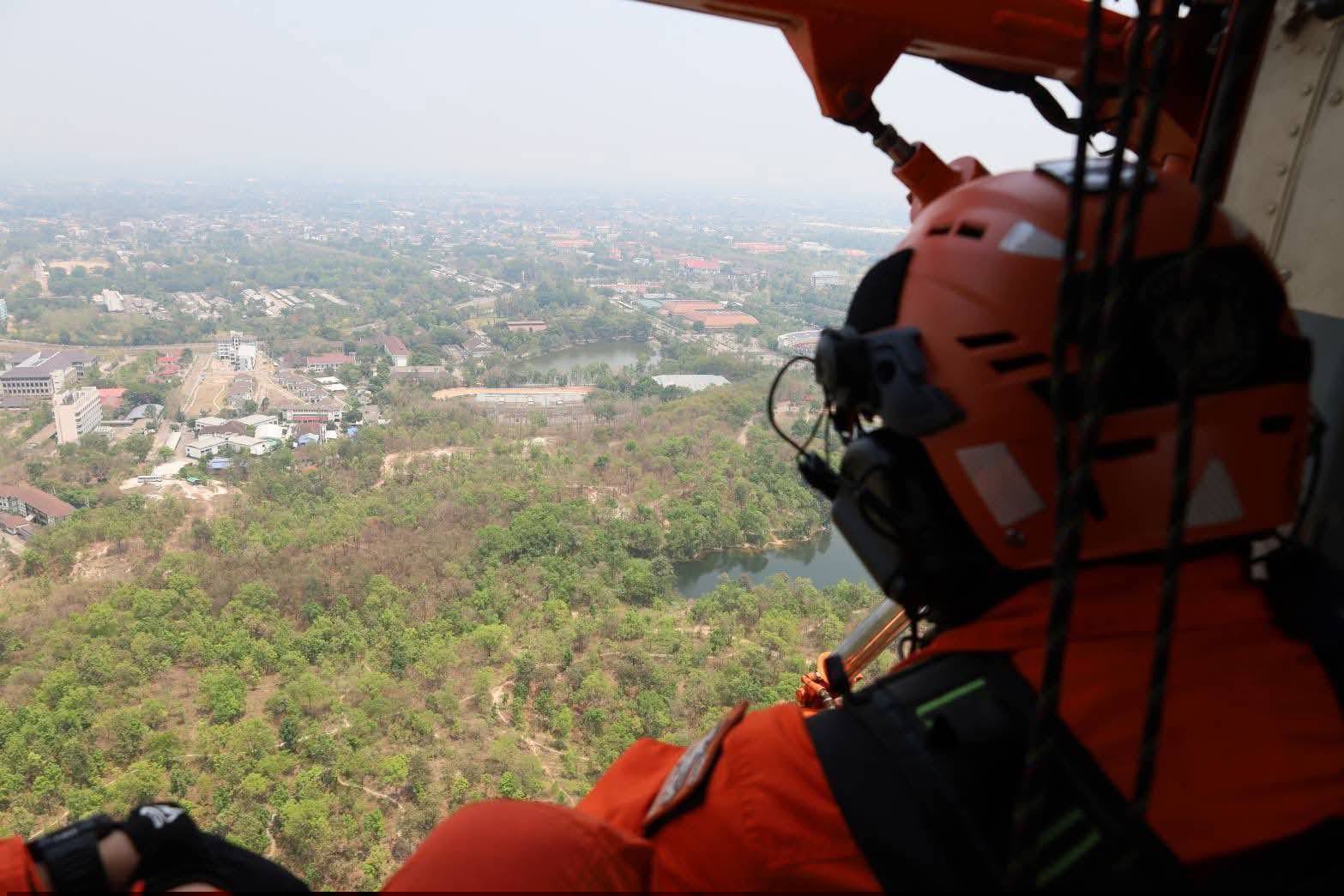 พร้อมกันนี้ ได้สนับสนุนภาคอากาศ โดยส่งเฮลิคอปเตอร์ของกระทรวงทรัพยากรธรรมชาติและสิ่งแวดล้อม บินโปรยน้ำลดความรุนแรงของไฟในพื้นที่สูง เพื่อควบคุมเพลิงให้อยู่ในวงจำกัดในช่วงเช้า ก่อนที่ในช่วงบ่ายจะส่งเฮลิคอปเตอร์รุ่น เคเอ 32 ของกรมป้องกันและบรรเทาสาธารณภัย เข้าร่วมปฏิบัติการโปรยน้ำดับไฟเพิ่มเติม เพื่อเสริมกำลังและป้องกันไม่ให้ไฟป่าลุกลามเข้าสู่พื้นที่สำคัญของจังหวัด