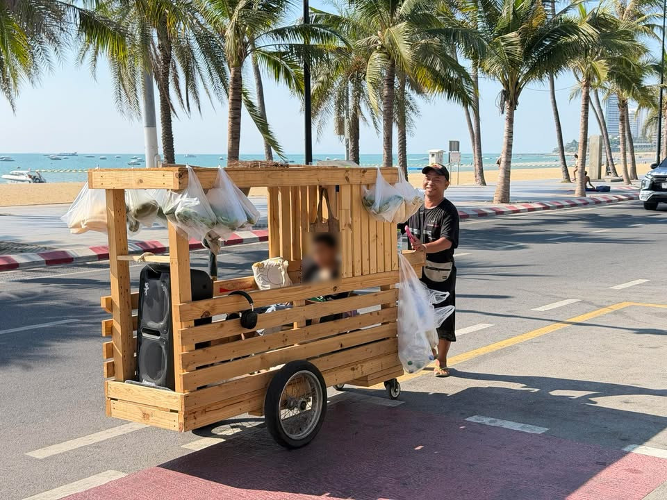 ย้อนชีวิตก่อนหน้านี้ พี่เดช เดินทางมาจากภาคอีสานเพื่อหางานทำในพัทยา เริ่มจากการเดินขายดอกไม้ตามสถานบันเทิง ก่อนจะปรับเปลี่ยนมาขายผักสด กระทั่งช่วง 4-5 ปีที่ผ่านมา ลูกชายเริ่มโตขึ้น จึงมีแนวคิดสร้างรถเข็นขนาดใหญ่ขึ้น โดยนำไม้เก่าและล้อมาประกอบเป็นรถพ่วงที่สามารถบรรทุกสินค้าได้มากขึ้น และจัดพื้นที่สำหรับให้ลูกชายนอนพักระหว่างทาง