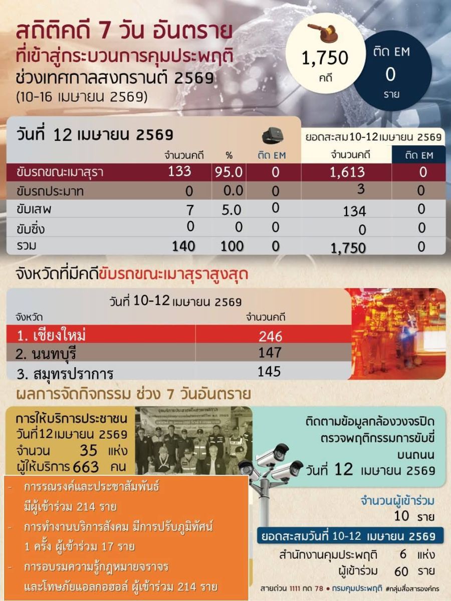 โดยมีสถิติคดีสะสมช่วง 3 วัน (10 - 12 เมษายน 2569) รวมทั้งสิ้น 1,750 คดี แบ่งเป็น คดีขับรถขณะเมาสุรา 1,613 คดี คิดเป็นร้อยละ 92.2 คดีขับเสพ 134 คดี คิดเป็นร้อยละ 7.6 และคดีขับรถประมาท 3 คดี คิดเป็นร้อยละ 0.2