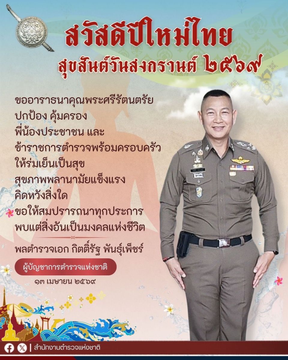 วันนี้ (13 เมษายน 2569) พล.ต.อ.กิตติ์รัฐ พันธุ์เพ็ชร์ ผู้บัญชาการตำรวจแห่งชาติ (ผบ.ตร.) ส่งคำอวยพร “สวัสดีปีใหม่ไทย สุขสันต์วันสงกรานต์ 2569 แก่ประชาชน ข้าราชการตำรวจ และครอบครัว ความว่า