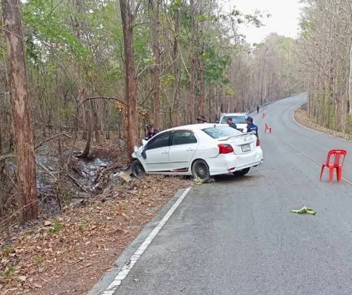 แม่ค้าก๋วยเตี๋ยวไก่มะระ ขับรถเก๋งหลุดโค้งชนต้นไม้เสียชีวิตในยานพาหนะ จ.ชัยภูมิ
