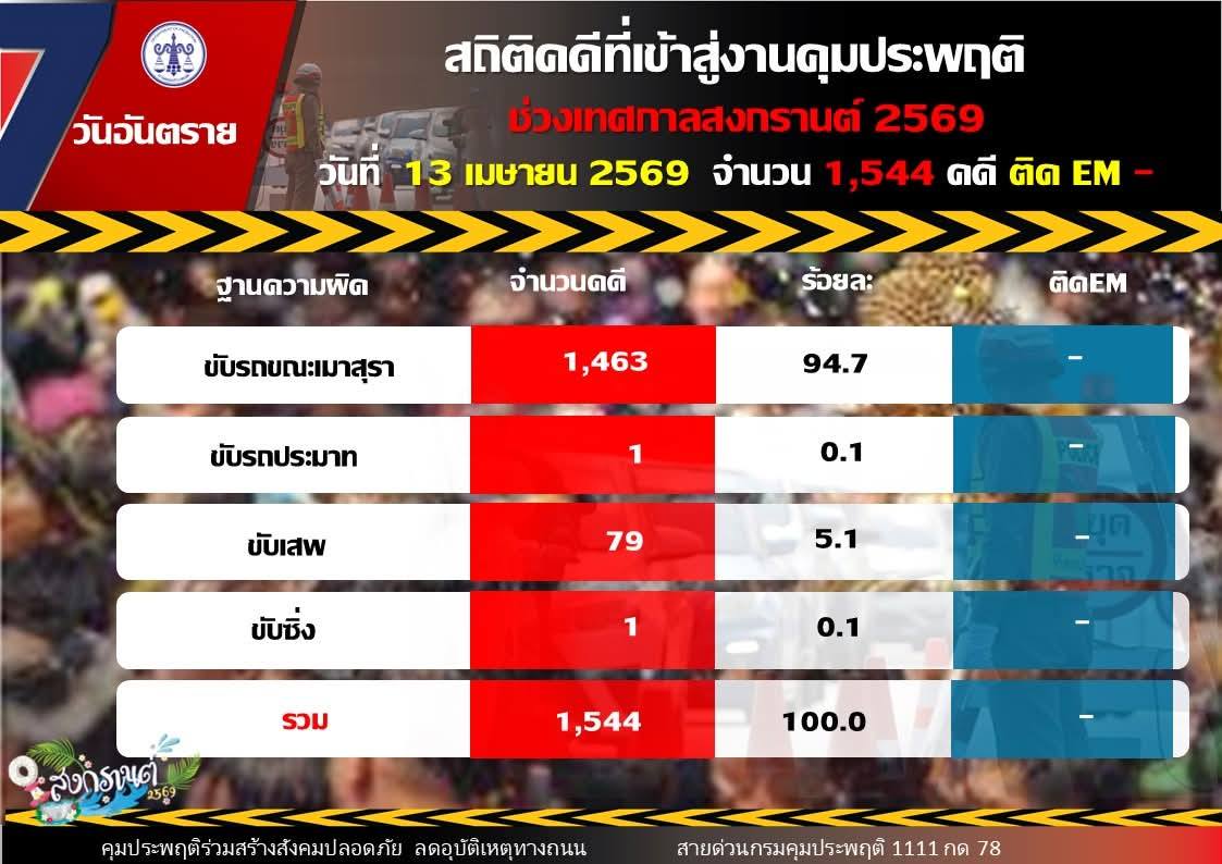 ขณะที่ยอดคดีสะสมตลอด 4 วัน (10 – 13 เมษายน 2569) จำนวนรวมทั้งสิ้น 3,294 คดี แบ่งเป็นคดีขับรถขณะเมาสุรา จำนวน 3,076 คดี คิดเป็นร้อยละ 93.4 คดีขับรถประมาท จำนวน 4 คดี คิดเป็นร้อยละ 0.1 คดีขับเสพ จำนวน 213 คดี คิดเป็นร้อยละ 6.47 และคดีขับซิ่ง จำนวน 1 คดี คิดเป็นร้อยละ 0.03