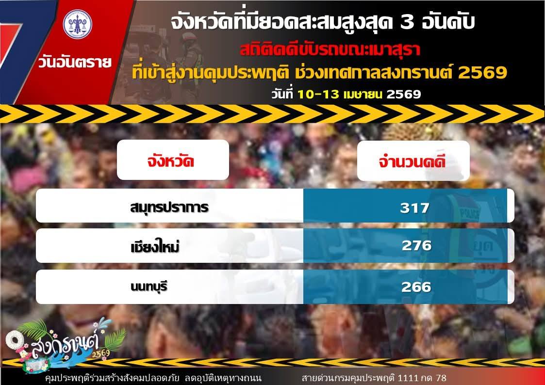 สำหรับจังหวัดที่มีสถิติคดีขับรถขณะเมาสุราสูงสุด 3 อันดับแรก ได้แก่ 1. จังหวัดสมุทรปราการ จำนวน 317 คดี 2. จังหวัดเชียงใหม่ จำนวน 276 คดี และ จังหวัดนนทบุรี จำนวน 266 คดี