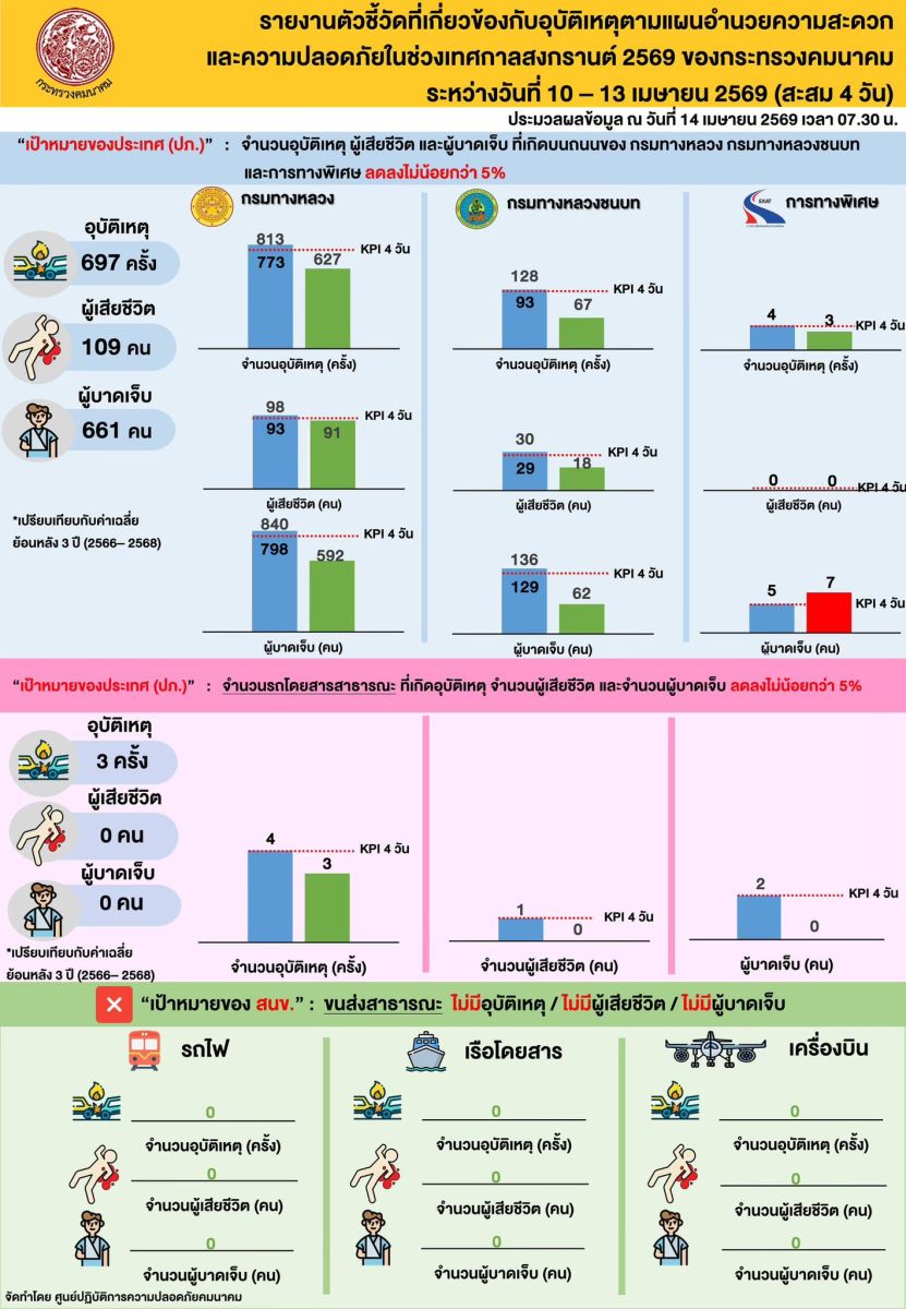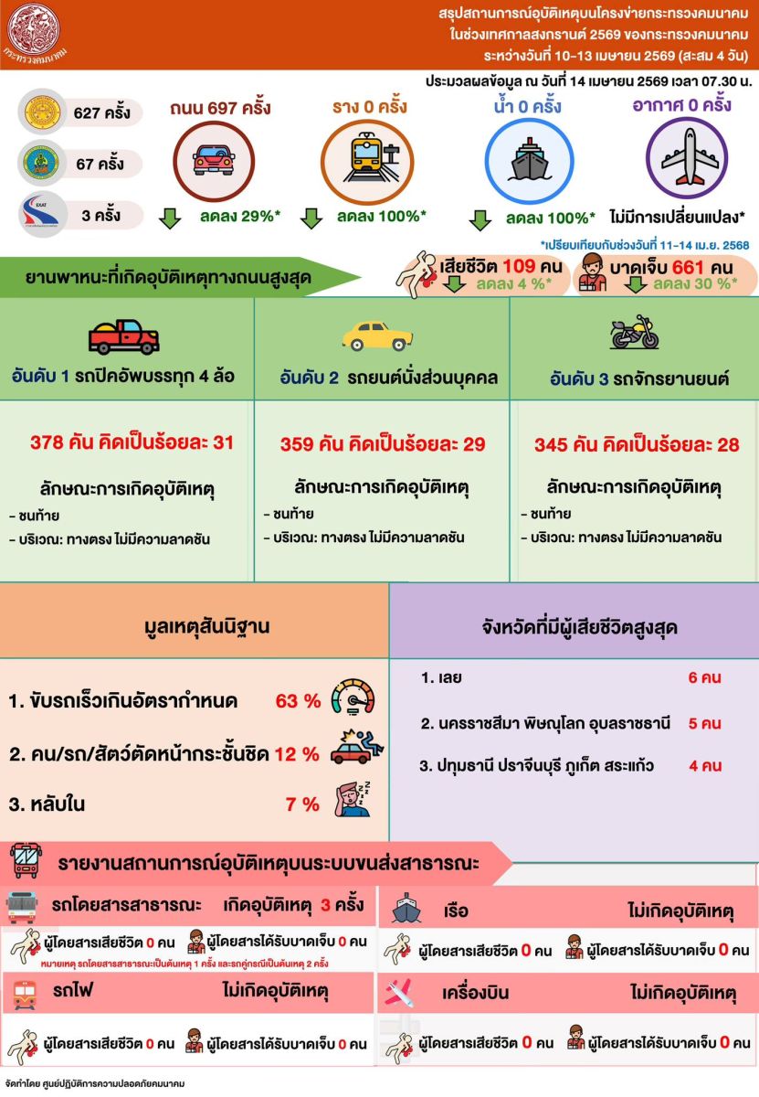 สำหรับสถิติอุบัติเหตุบนโครงข่ายของกระทรวงคมนาคมสะสม 4 วัน พบว่า โครงข่ายทางบกเกิดอุบัติเหตุรวม 697 ครั้ง มีผู้บาดเจ็บ 661 คน เสียชีวิต 109 คน สาเหตุหลักเกิดจากการขับรถเร็วเกินกำหนด 442 ครั้ง คิดเป็นร้อยละ 63 ยานพาหนะที่เกิดเหตุสูงสุดคือ รถพิกอัปบรรทุก 4 ล้อ 378 คัน ลักษณะพื้นที่เกิดเหตุส่วนใหญ่เป็นทางตรงไม่มีความลาดชัน 504 ครั้ง คิดเป็นร้อยละ 72 จังหวัดเลยมีผู้เสียชีวิตสูงสุด 6 คน ขณะที่กรุงเทพฯ เกิดอุบัติเหตุสูงสุด 35 ครั้ง ทั้งนี้ เมื่อเปรียบเทียบกับช่วงเดียวกันของปีที่ผ่านมาพบว่า อุบัติเหตุลดลงร้อยละ 29 ผู้เสียชีวิตลดลงร้อยละ 4 และผู้บาดเจ็บลดลงร้อยละ 30 ส่วนระบบขนส่งรถโดยสารสาธารณะเกิดอุบัติเหตุ 3 ครั้ง ไม่มีผู้บาดเจ็บหรือผู้เสียชีวิต ขณะที่โครงข่ายทางราง ทางน้ำ และทางอากาศไม่มีรายงานอุบัติเหตุ