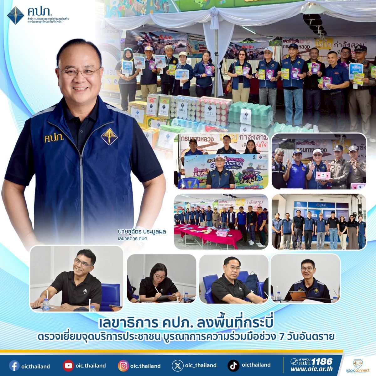เมื่อวันที่ 11 เมษายน 2569 นายชูฉัตร ประมูลผล เลขาธิการคณะกรรมการกำกับและส่งเสริมการประกอบธุรกิจประกันภัย (เลขาธิการ คปภ.) พร้อมด้วย นายอาภากร ปานเลิศ รองเลขาธิการ ด้านกำกับธุรกิจประกันภัย นางสาวชัชวริน โชติชูตระกูล ผู้ช่วยเลขาธิการ สายคุ้มครองสิทธิประโยชน์ และนายคณานุสรณ์ เที่ยงตระกูล ผู้ช่วยเลขาธิการ สายบริหาร ลงพื้นที่จังหวัดกระบี่ เพื่อตรวจเยี่ยมการให้บริการประชาชนในช่วงเทศกาลสงกรานต์ ทั้งนี้ จังหวัดกระบี่เป็นจังหวัดท่องเที่ยวสำคัญของประเทศ โดยเฉพาะในช่วงเทศกาลสงกรานต์ที่มีนักท่องเที่ยวทั้งชาวไทยและชาวต่างชาติเดินทางเข้ามาเป็นจำนวนมาก ส่งผลให้ปริมาณการจราจรทั้งทางถนนและทางทะเลเพิ่มสูงขึ้น สำนักงาน คปภ. จึงให้ความสำคัญในการลงพื้นที่เพื่อติดตามสถานการณ์อย่างใกล้ชิด พร้อมทั้งสนับสนุนการดำเนินงานของหน่วยงานในพื้นที่ เพื่อให้ประชาชนและนักท่องเที่ยวได้รับความคุ้มครองด้านการประกันภัยอย่างทั่วถึงและทันท่วงที