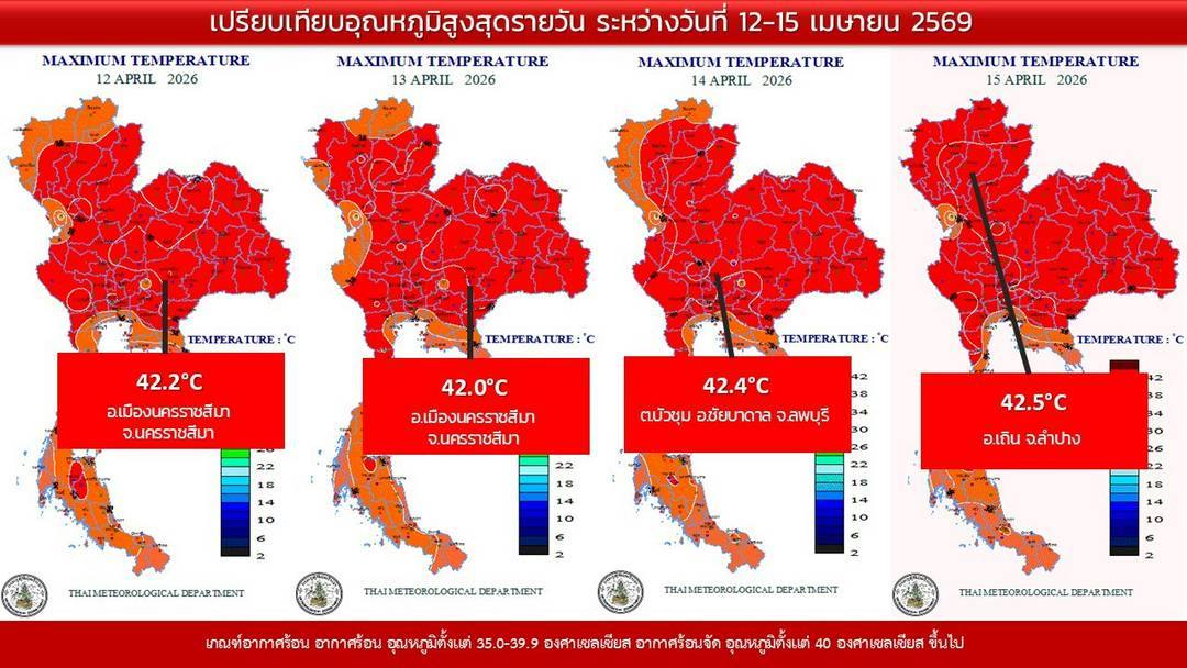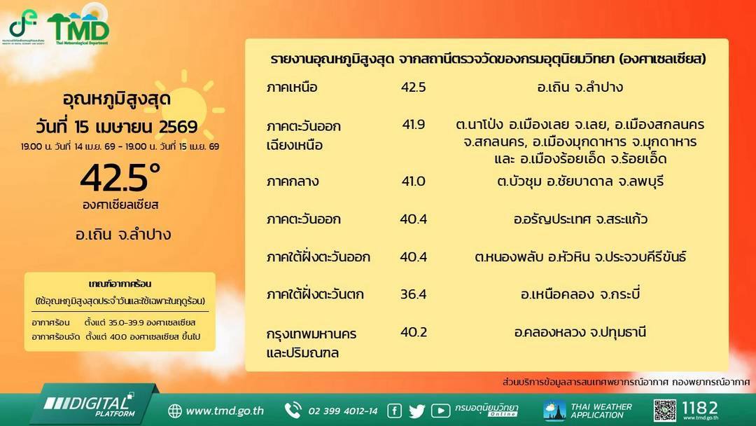 อุณหภูมิสูงสุดบริเวณกรุงเทพมหานครและปริมณฑล เมื่อวานนี้(15 เม.ย. 69) วัดได้ 40.2 องศาเซลเซียส ที่ อ.คลองหลวง จ.ปทุมธานี