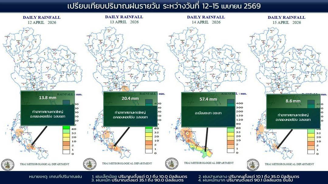 รายงานฝนสะสม 24 ชม.ที่ผ่านมา(15 เม.ย. 69) ตั้งแต่เวลา 07.00 น.ของวันที่ 15 เม.ย. 69 ถึง เวลา 07.00 น. ของวันที่ 16 เม.ย. 69 ของสถานีอุตุนิยมวิทยา มีรายงานฝนตกเล็กน้อย ปริมาณฝนมากที่สุดวัดได้ 8.6 ที่ ท่าอากาศยานหาดใหญ่ อ.คลองหอยโข่ง จ.สงขลา