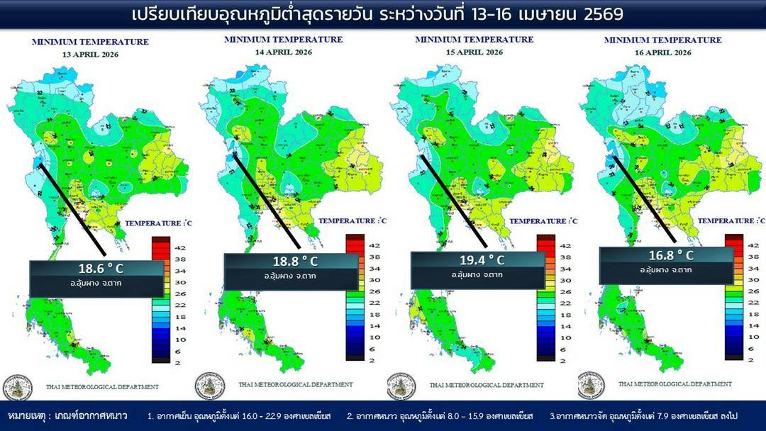 อุณหภูมิต่ำสุดบริเวณประเทศไทย เมื่อเช้าวันนี้ (16 เม.ย. 69) วัดได้ 16.8 องศาเซลเซียส ที่ อ.อุ้มผาง จ.ตาก