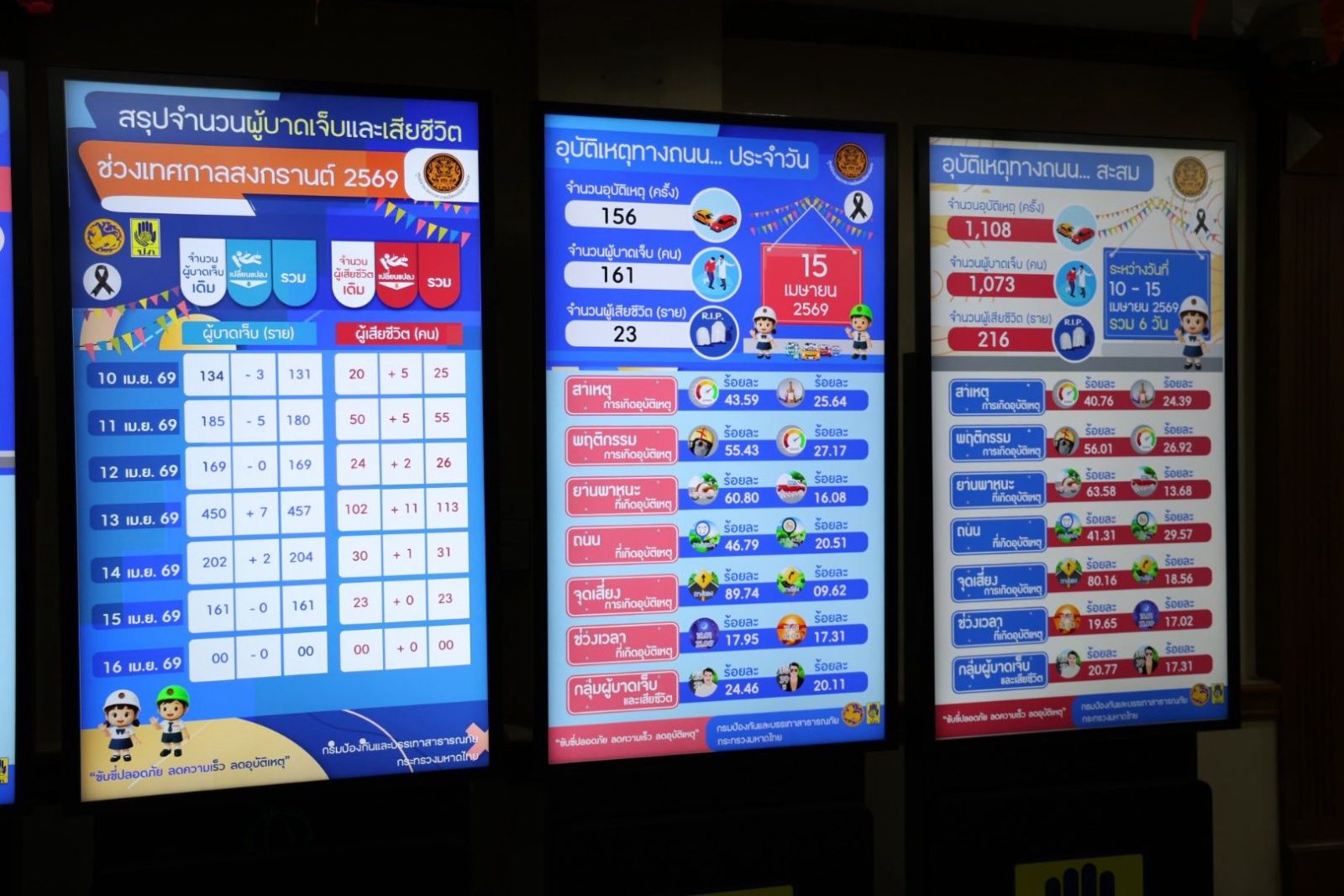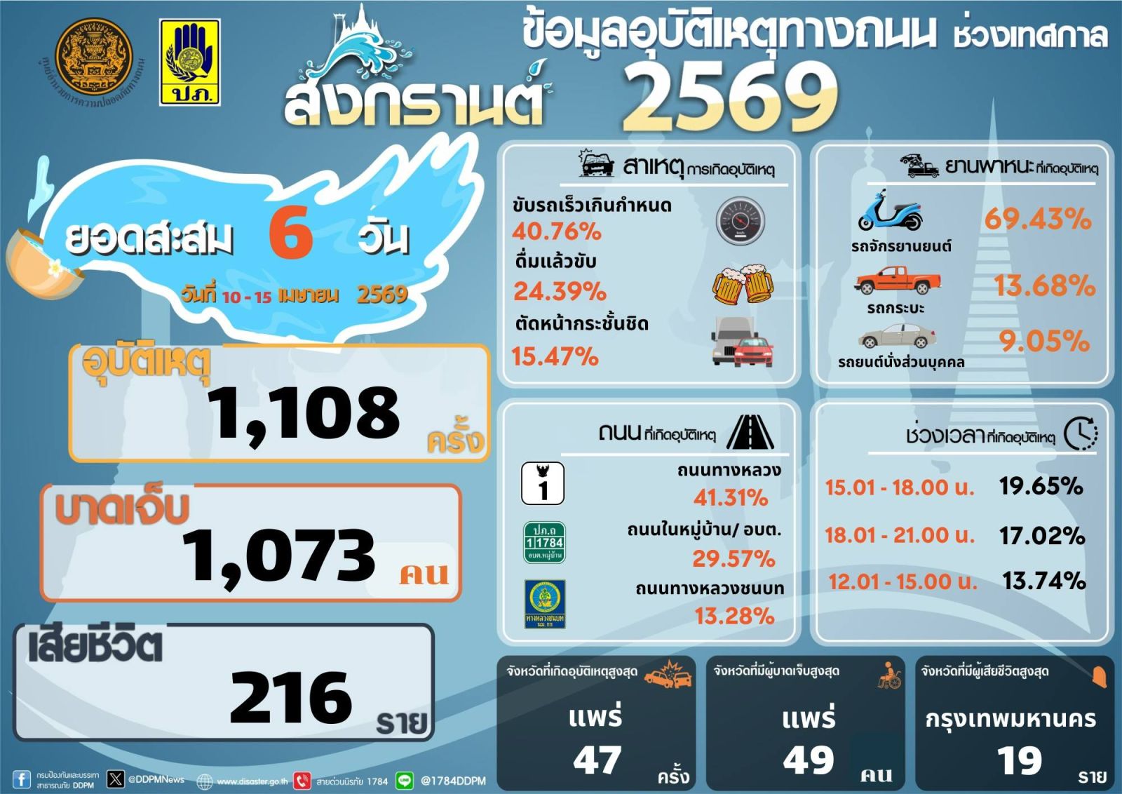 สรุปอุบัติเหตุทางถนนสะสมในช่วง 6 วันของการรณรงค์ (10 – 15 เม.ย. 69) เกิดอุบัติเหตุรวม 1,108 ครั้ง ผู้บาดเจ็บ รวม 1,073 คน ผู้เสียชีวิต รวม 216 ราย จังหวัดที่เกิดอุบัติเหตุสะสมสูงสุดได้แก่ แพร่ (47 ครั้ง) จังหวัดที่มีผู้บาดเจ็บสะสมสูงสุด ได้แก่ แพร่ (49 คน) จังหวัดที่มีผู้เสียชีวิตสะสมสูงสุด ได้แก่ กรุงเทพมหานคร (19 ราย)