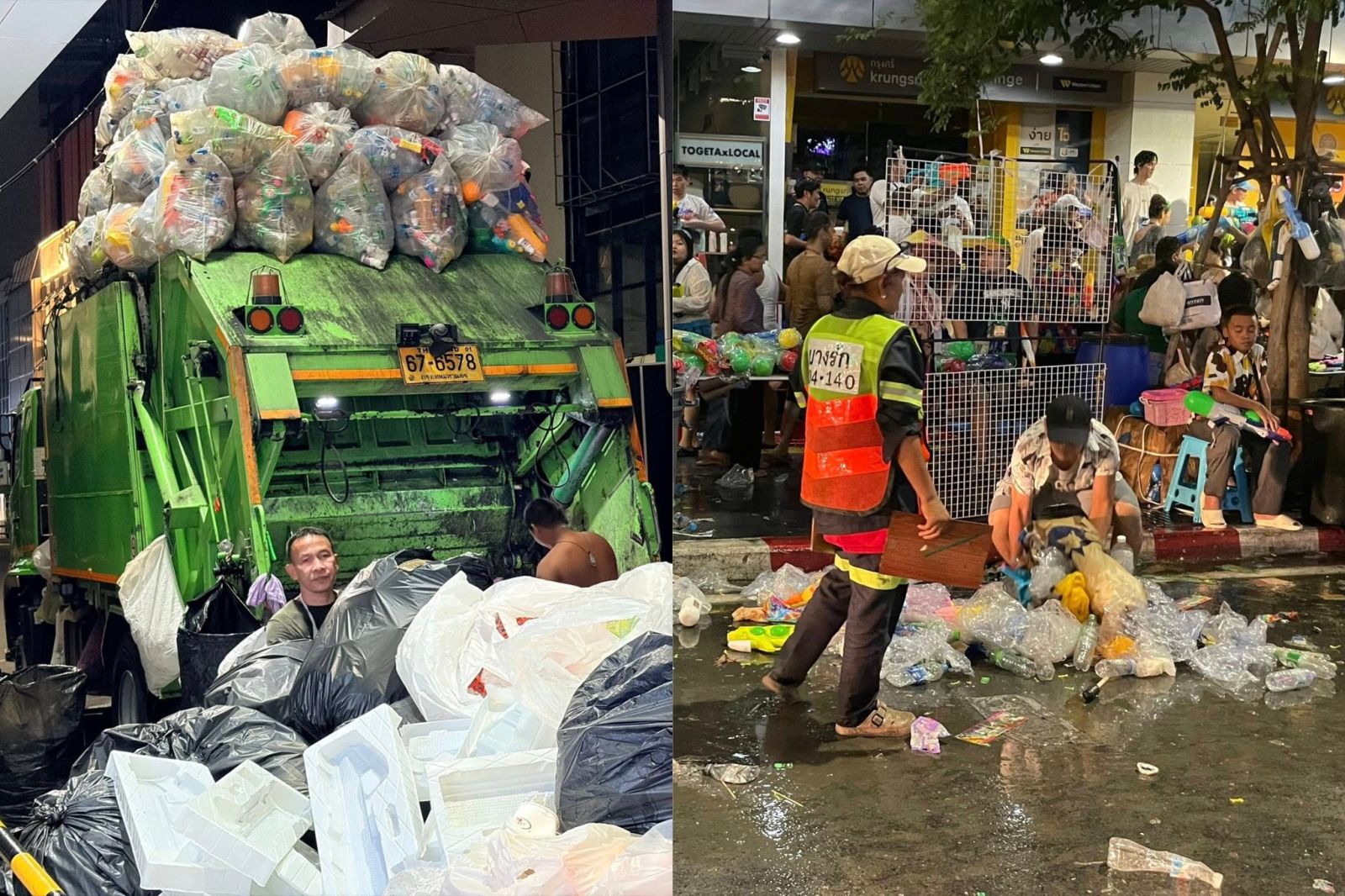 3. ปริมาณขยะจากพื้นที่จัดงาน สำหรับปริมาณขยะสะสมในพื้นที่จัดงานสำคัญ (11 - 15 เม.ย. 69) มีจำนวนรวมทั้งสิ้น 336 ตัน เพิ่มขึ้นเมื่อเทียบกับยอดรวมปี 2568 ที่มียอดรวม 250.5 ตัน โดยพื้นที่ที่มีปริมาณขยะสูงสุด ได้แก่ ถนนข้าวสาร 102.46 ตัน ถนนสีลม 86.17 ตัน และไอคอนสยาม 58.70 ตัน ซึ่งขยะส่วนใหญ่ประมาณ 81.52% เป็นขยะทั่วไป มีขยะเศษอาหารประมาณ 14.1% และมีขยะรีไซเคิลประมาณ 4.38%