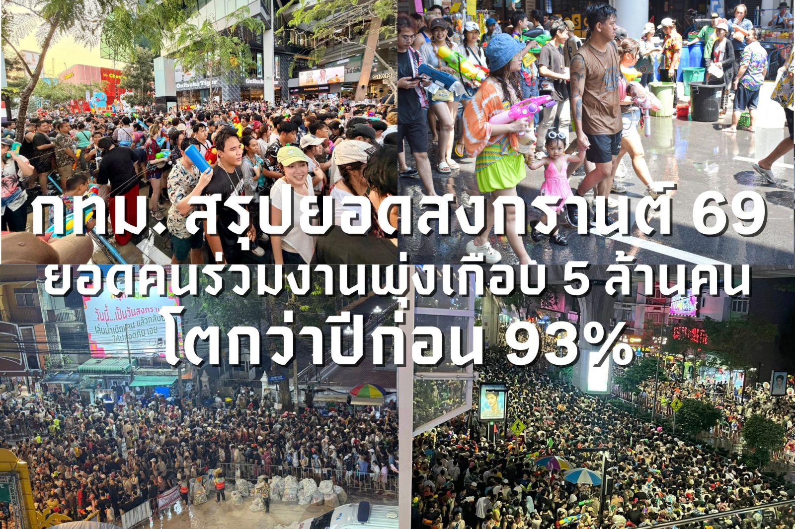 กทม. สรุปยอดสงกรานต์ 69 ยอดคนร่วมงานพุ่งเกือบ 5 ล้านคน โตกว่าปีก่อน 93% โดยสถิติขยะ เพลิงไหม้หญ้า และยอดเสียชีวิตจากอุบัติเหตุ พบเพิ่มสูงขึ้นเช่นกัน