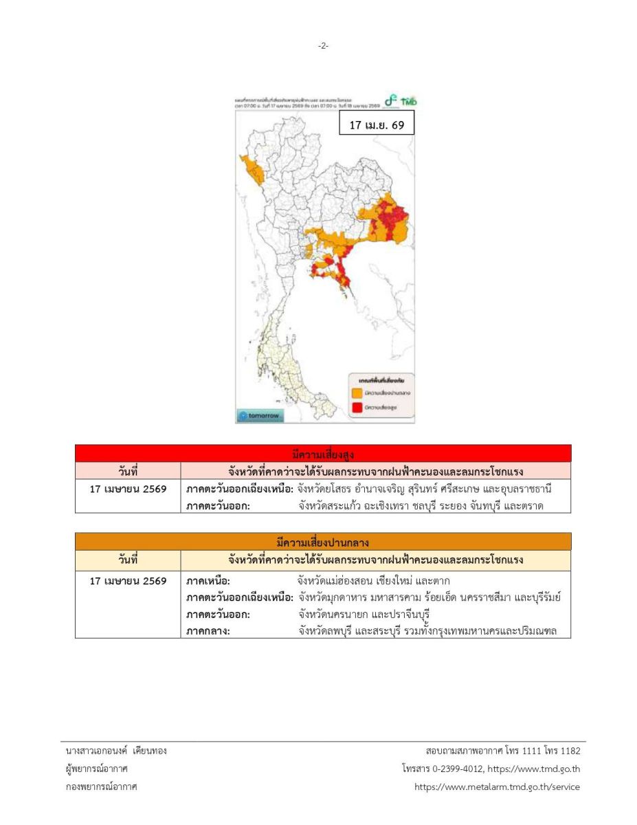 วันที่ 17 เมษายน พ.ศ. 2569 เวลา 05.00 น. กรมอุตุนิยมวิทยา ออกประกาศ ฉบับที่ 6 (25/2569) เรื่อง พายุฤดูร้อนบริเวณประเทศไทยตอนบน (มีผลกระทบจนถึงวันที่ 20 เมษายน 2569)