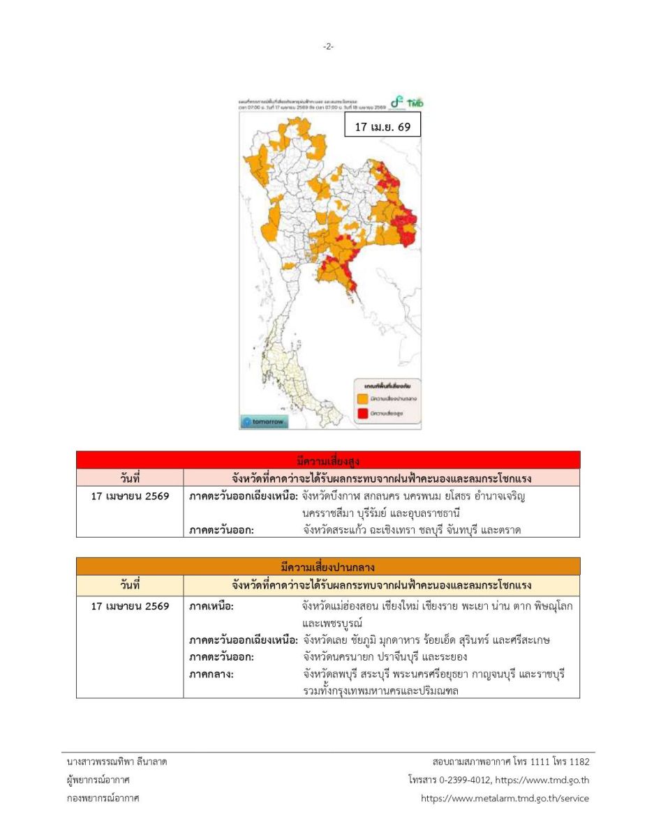 ประกาศ ณ วันที่ 17 เมษายน พ.ศ. 2569 เวลา 17.00 น. กรมอุตุนิยมวิทยาจะออกประกาศฉบับต่อไปในวันที่ 18 เมษายน พ.ศ. 2559 เวลา 05.00 น.