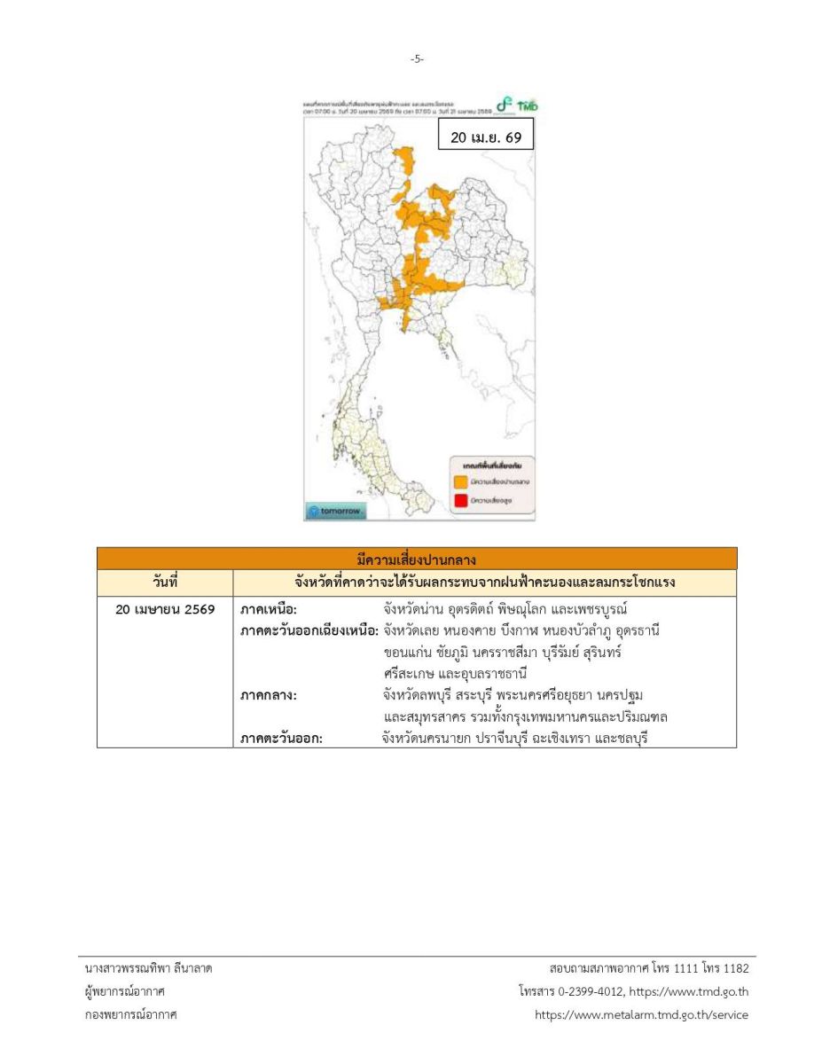 ประกาศกรมอุตุนิยมวิทยา ฉบับที่ 7(26/2569) พายุฤดูร้อนบริเวณประเทศไทยตอนบน (มีผลกระทบถึงวันที่ 20 เมษายน 2569)