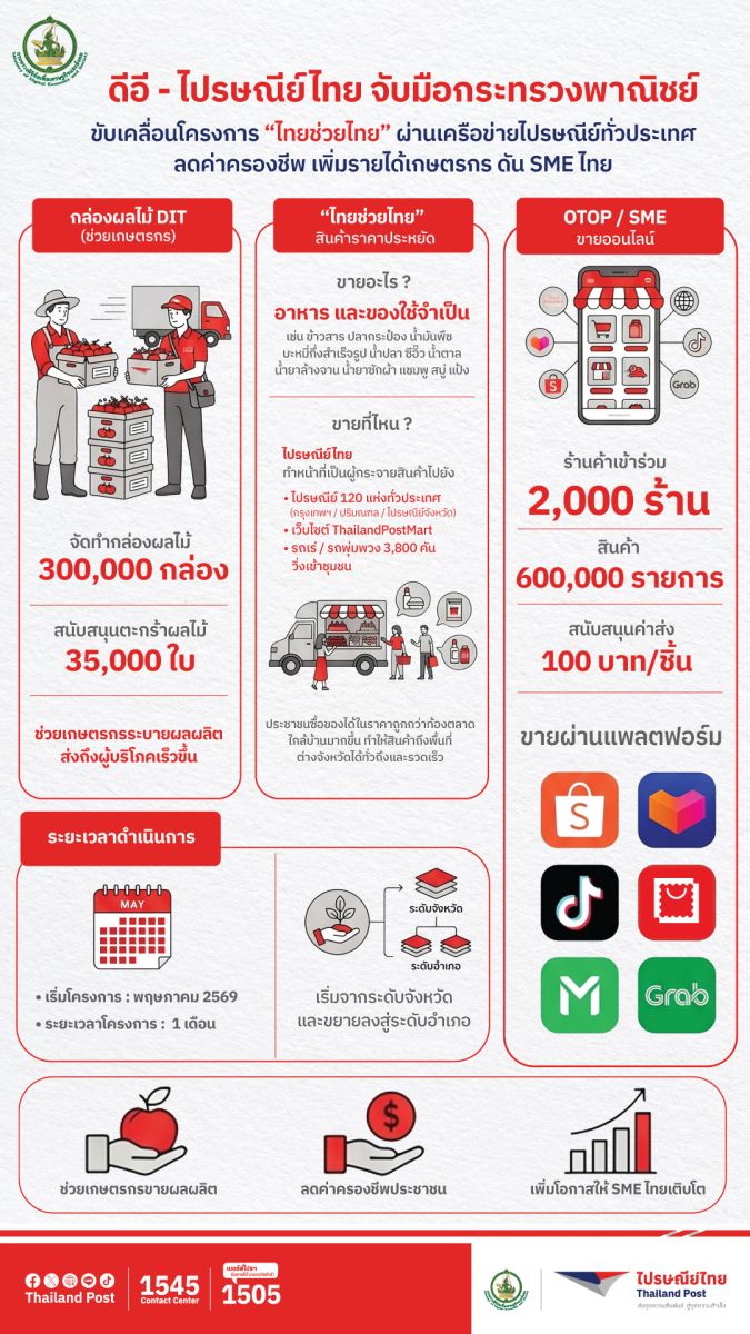 กรุงเทพฯ 18 เมษายน 2569 – บริษัท ไปรษณีย์ไทย จำกัด ขานรับนโยบายกระทรวงดิจิทัลเพื่อเศรษฐกิจและสังคม (ดีอี) เดินหน้าโครงการ “ไทยช่วยไทย” ผนึกกำลังกรมการค้าภายใน กระทรวงพาณิชย์ ใช้เครือข่ายไปรษณีย์ทั่วประเทศเป็นโครงข่ายหลักในการกระจายสินค้าราคาประหยัดสู่ประชาชน พร้อมยกระดับบทบาทองค์กรสู่โครงสร้างพื้นฐานด้านโลจิสติกส์เพื่อสังคม มุ่งลดค่าครองชีพ สร้างรายได้ และขับเคลื่อนเศรษฐกิจฐานรากอย่างเป็นรูปธรรม