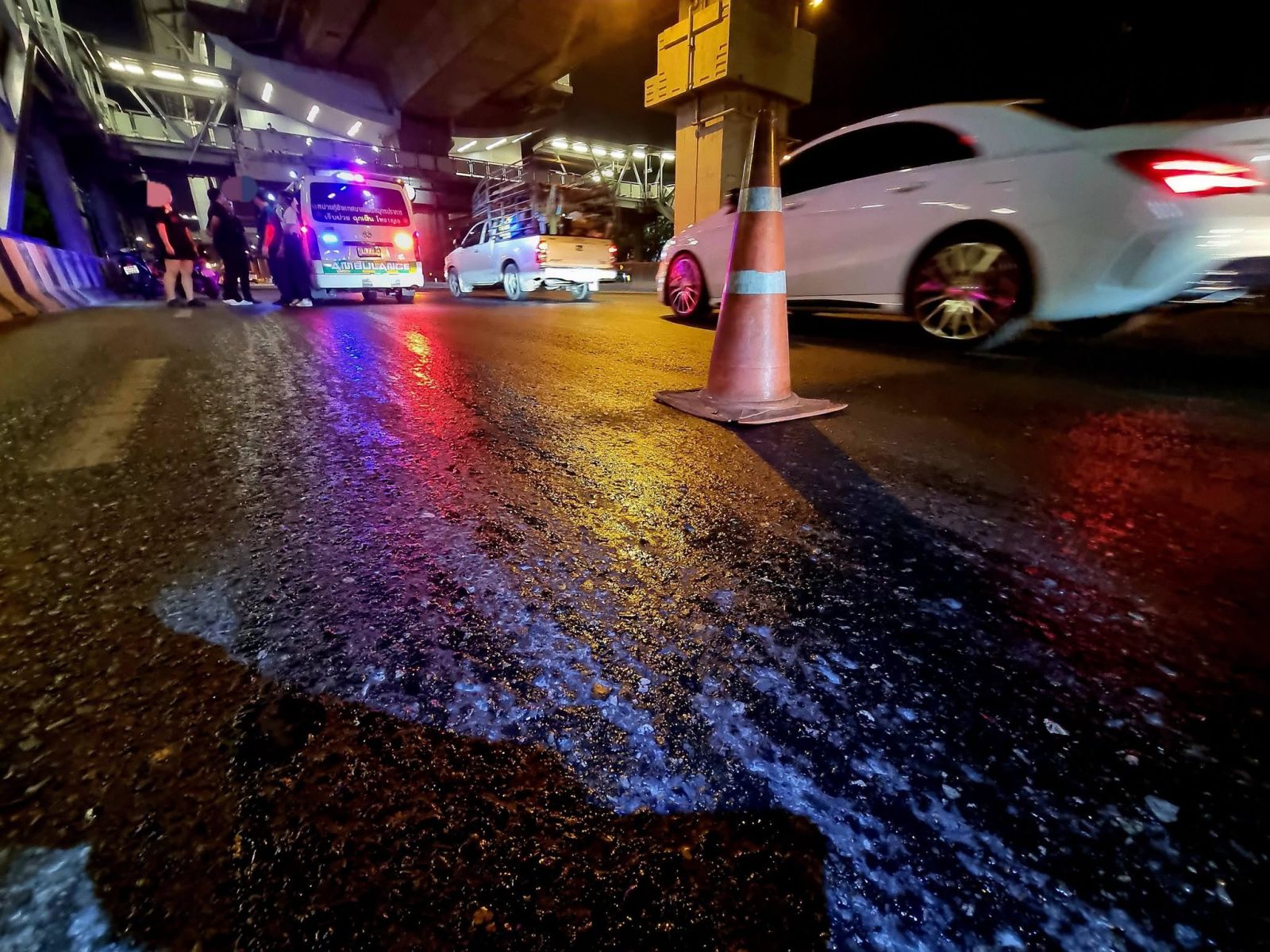 เวลา 20.30 น. ถ.สุขุมวิท ขาเข้า มุ่งหน้า แพรกษา ตั้งแต่หน้าปั้มบางจาก โค้งโพธิ์ยาวมาถึงบีทีเอส สถานีสายลวด มีน้ำมันหกรดพื้นผิวจราจร รถจยย. ลื่นล้มไปหลายคัน จนท.อยู่ระหว่างเข้าไปทำความสะอาด
