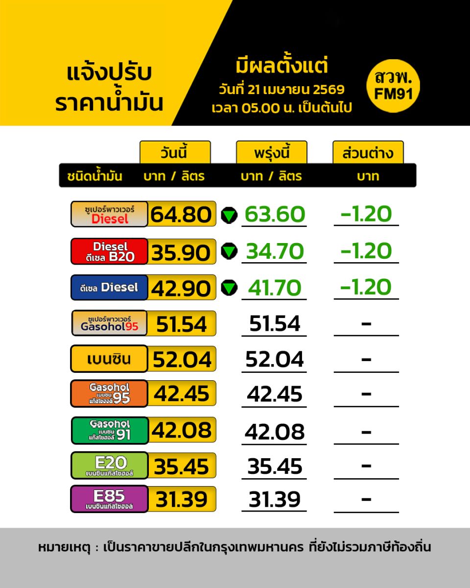 มีผลวันที่ 21 เม.ย. 69 ตั้งแต่ เวลา 05.00 น. เป็นต้นไป