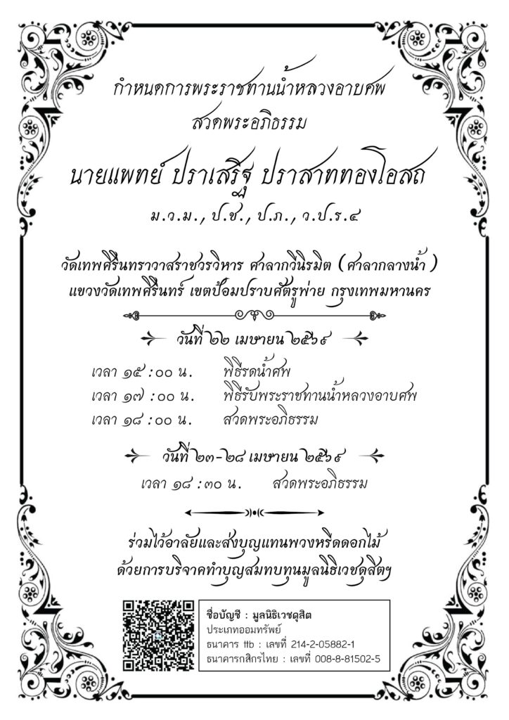สำหรับ กำหนดการบำเพ็ญกุศลและสวดพระอภิธรรมจะจัดขึ้น ณ ศาลากลางน้ำ วัดเทพศิรินทราวาสราชวรวิหาร โดยในวันที่ 22 เมษายน 2569 จะมีพิธีรดน้ำศพเวลา 15.00 น. พิธีพระราชทานน้ำหลวงอาบศพเวลา 17.00 น. และสวดพระอภิธรรมเวลา 18.00 น. ส่วนในวันที่ 23-28 เมษายน 2569 จะสวดพระอภิธรรมในเวลา 18.30 น.