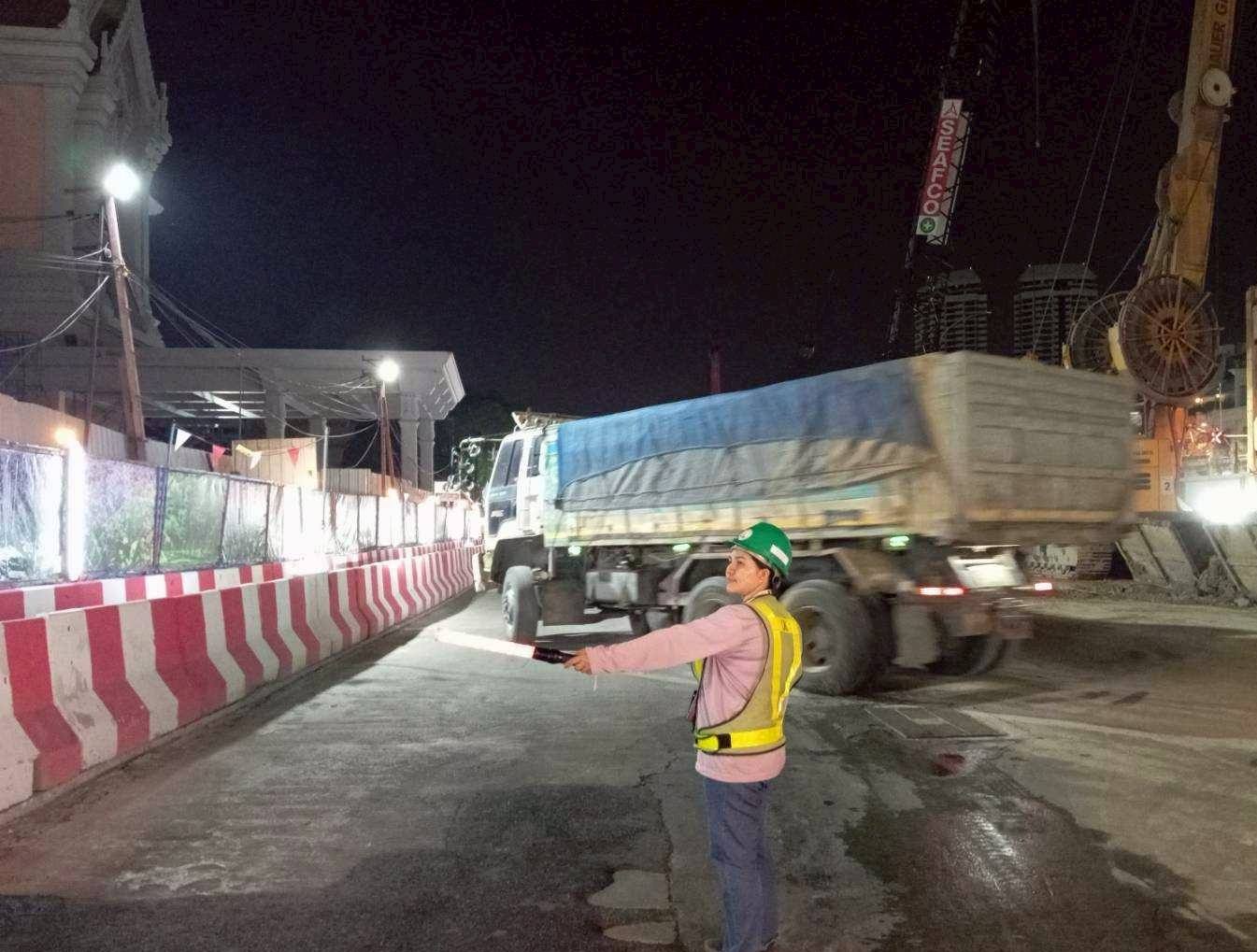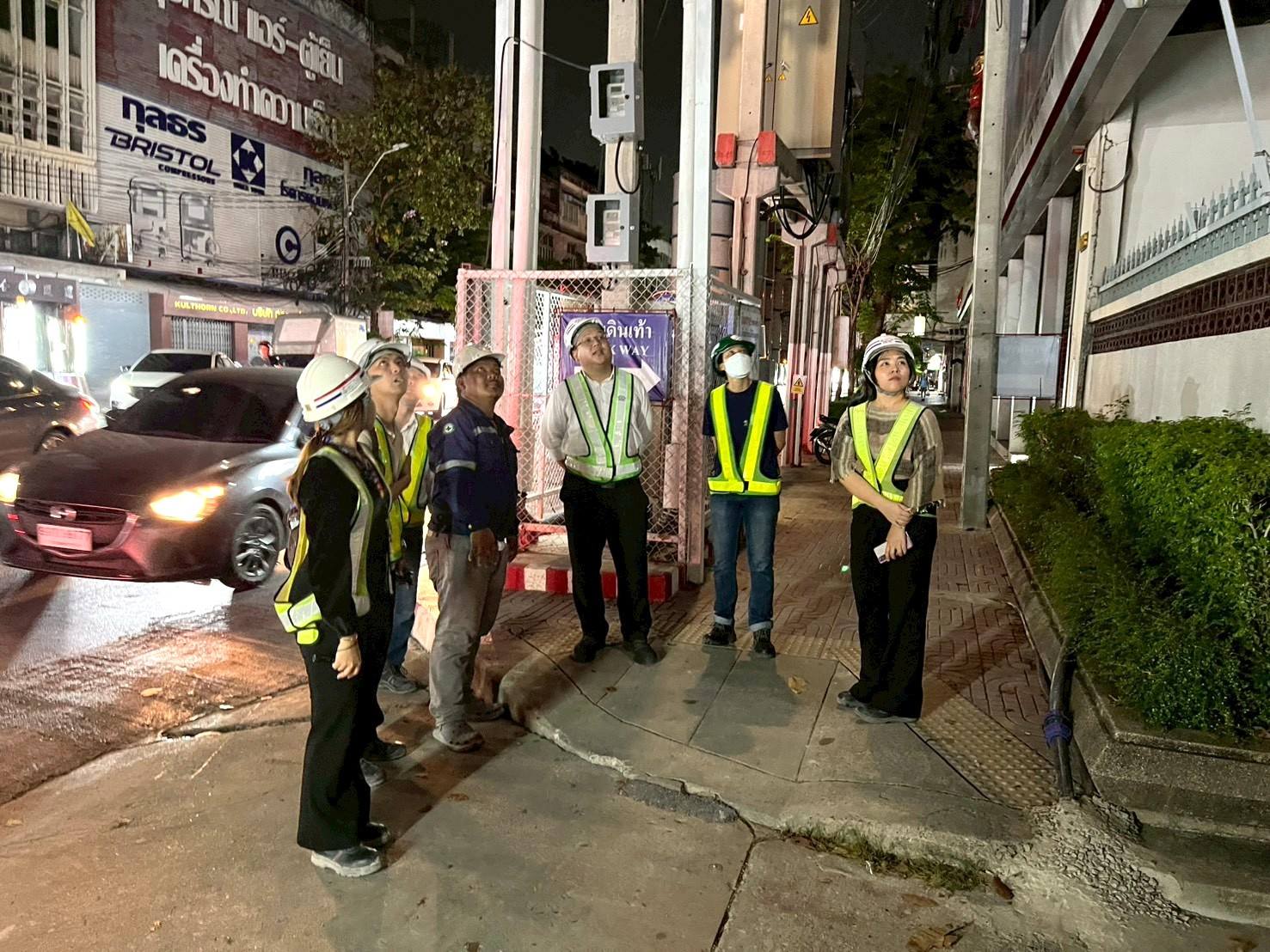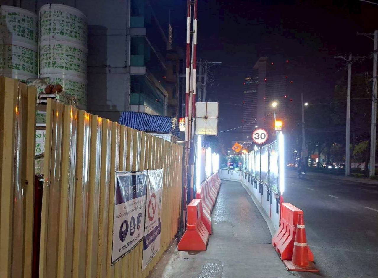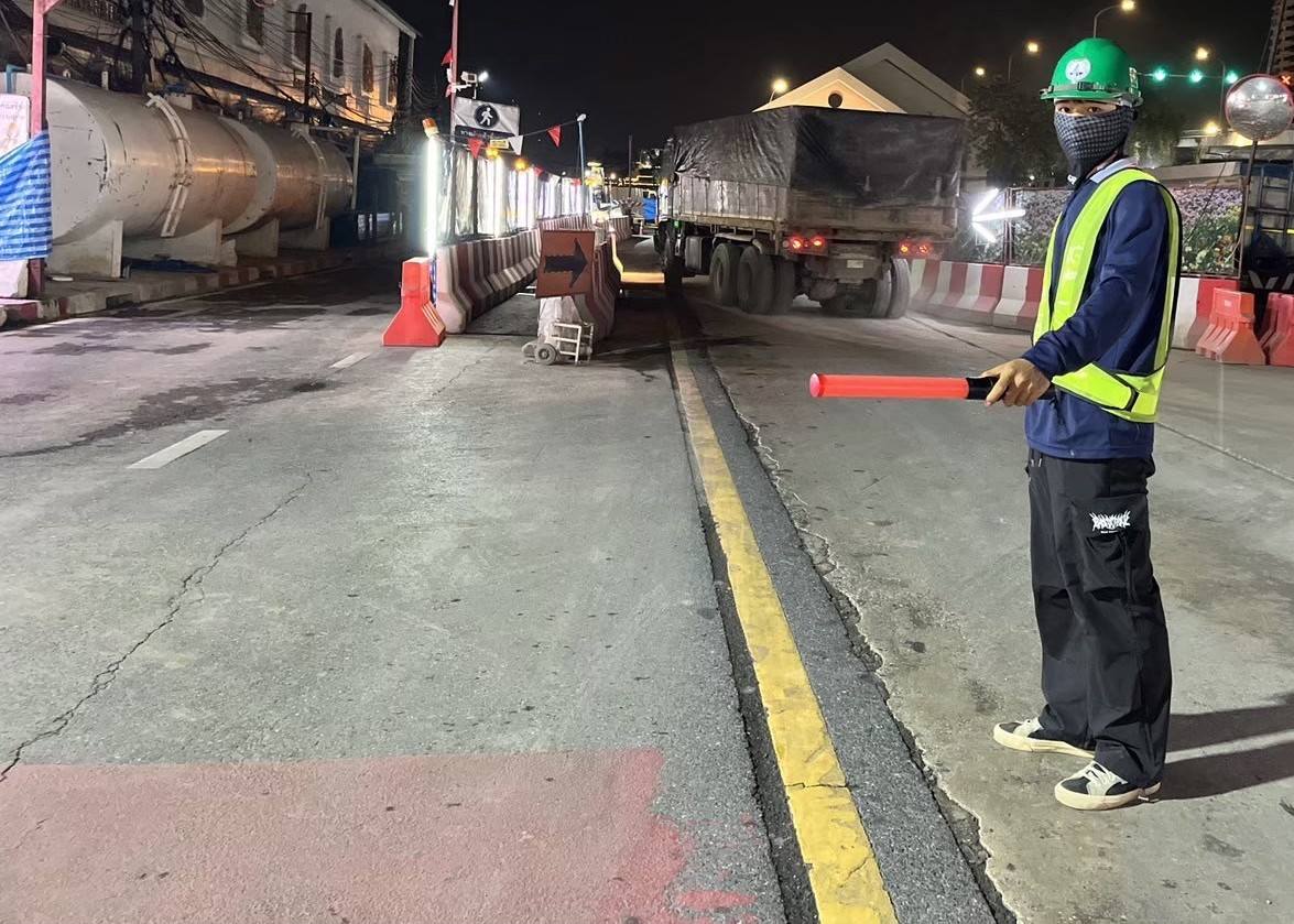 การรถไฟฟ้าขนส่งมวลชนแห่งประเทศไทย (รฟม.) โดยสำนักงานความปลอดภัย อาชีวอนามัยและสภาพแวดล้อมในการทำงาน (สปอ.) ลงพื้นที่ตรวจสอบการดำเนินงานด้านความปลอดภัยในการก่อสร้าง โครงการรถไฟฟ้าสายสีส้ม ช่วงบางขุนนนท์ – ศูนย์วัฒนธรรมแห่งประเทศไทย ช่วงเวลากลางคืน (Night Audit) โดยลงพื้นที่บริเวณสถานีบางขุนนนท์ สถานีศิริราช สถานีสนามหลวง สถานีอนุสาวรีย์ประชาธิปไตย สถานีหลานหลวง และสถานียมราช โดยได้ตรวจสอบการติดตั้งแผงผ้าใบ ไฟส่องสว่าง ไฟสัญญาณเตือน และป้ายเตือนต่างๆ ตามแนวเขตก่อสร้าง ให้มั่นคงแข็งแรง อยู่ในตำแหน่งที่ปลอดภัย สามารถเห็นได้อย่างชัดเจน การเก็บวัสดุอุปกรณ์ที่ไม่ใช้แล้วให้เรียบร้อย การจัดวางแนวแบริเออร์ (Barriers) ให้เป็นระเบียบไม่ให้ล้ำเข้าพื้นผิวจราจร ซึ่งเป็นการป้องกันอุบัติเหตุที่อาจเกิดขึ้นจากการใช้ถนนในบริเวณดังกล่าว พร้อมกำชับให้เจ้าหน้าที่ทุกคนสวมใส่อุปกรณ์คุ้มครองความปลอดภัยส่วนบุคคลให้ครบถ้วนตลอดระยะเวลาที่ปฏิบัติงาน และปฏิบัติตามมาตรฐานความปลอดภัยที่กำหนดอย่างเคร่งครัด