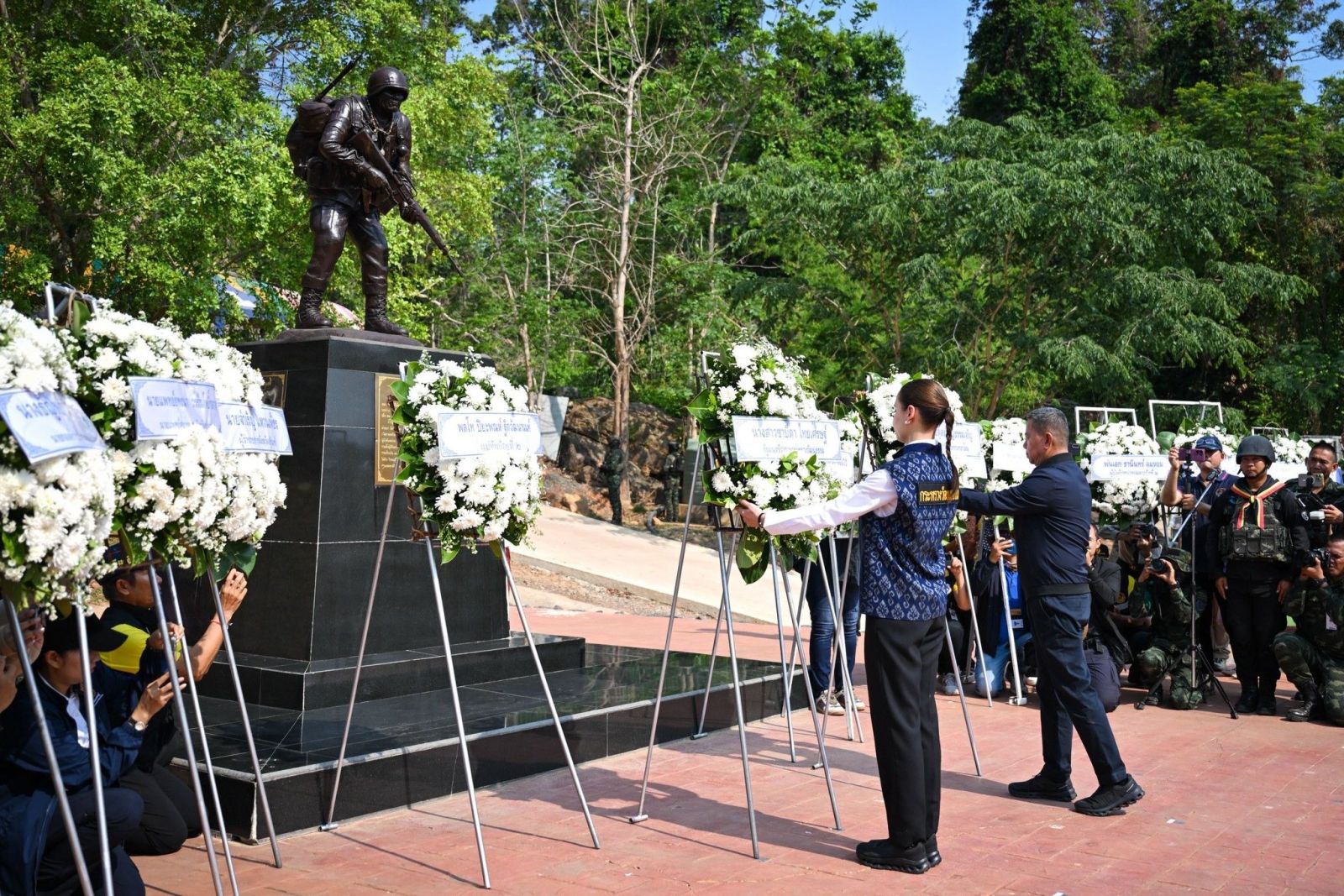 ภายหลังเสร็จสิ้นพิธี คณะได้ลงพื้นที่ตรวจเยี่ยมฐานปฏิบัติการบริเวณเนิน 350 รับฟังบรรยายสรุปสถานการณ์ด้านความมั่นคง และตรวจภูมิประเทศในพื้นที่สำคัญตามแนวชายแดน เพื่อเสริมสร้างความพร้อมในการดูแลความมั่นคงของพื้นที่ ตลอดจนติดตามการพัฒนาในพื้นที่ตามแนวทาง ‘น้ำไหล ไฟสว่าง ทางดี มีสัญญาณโทรศัพท์’ อันเป็นการยกระดับคุณภาพชีวิตของประชาชนควบคู่กับการเสริมสร้างความมั่นคงอย่างยั่งยืน ทั้งนี้ มีครอบครัวของทหารกล้าที่สละชีพเพื่อชาติร่วมในพิธีสดุดีรำลึกวีรกรรมอย่างพร้อมเพรียง