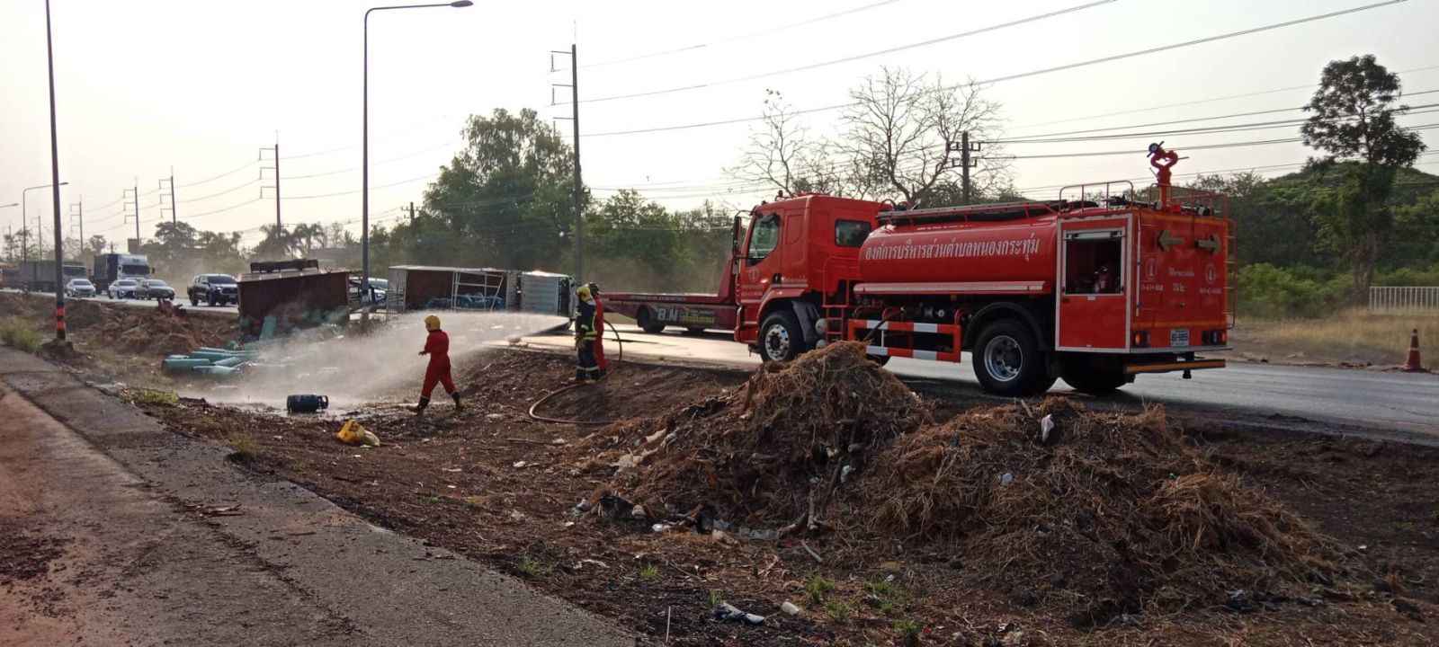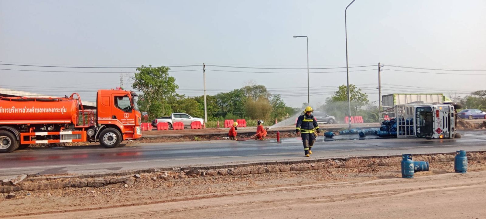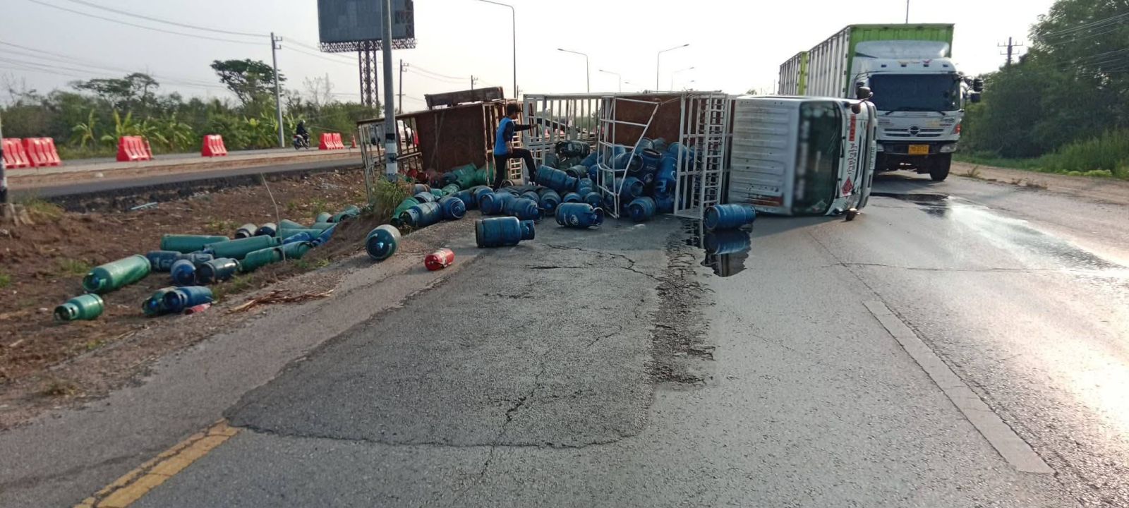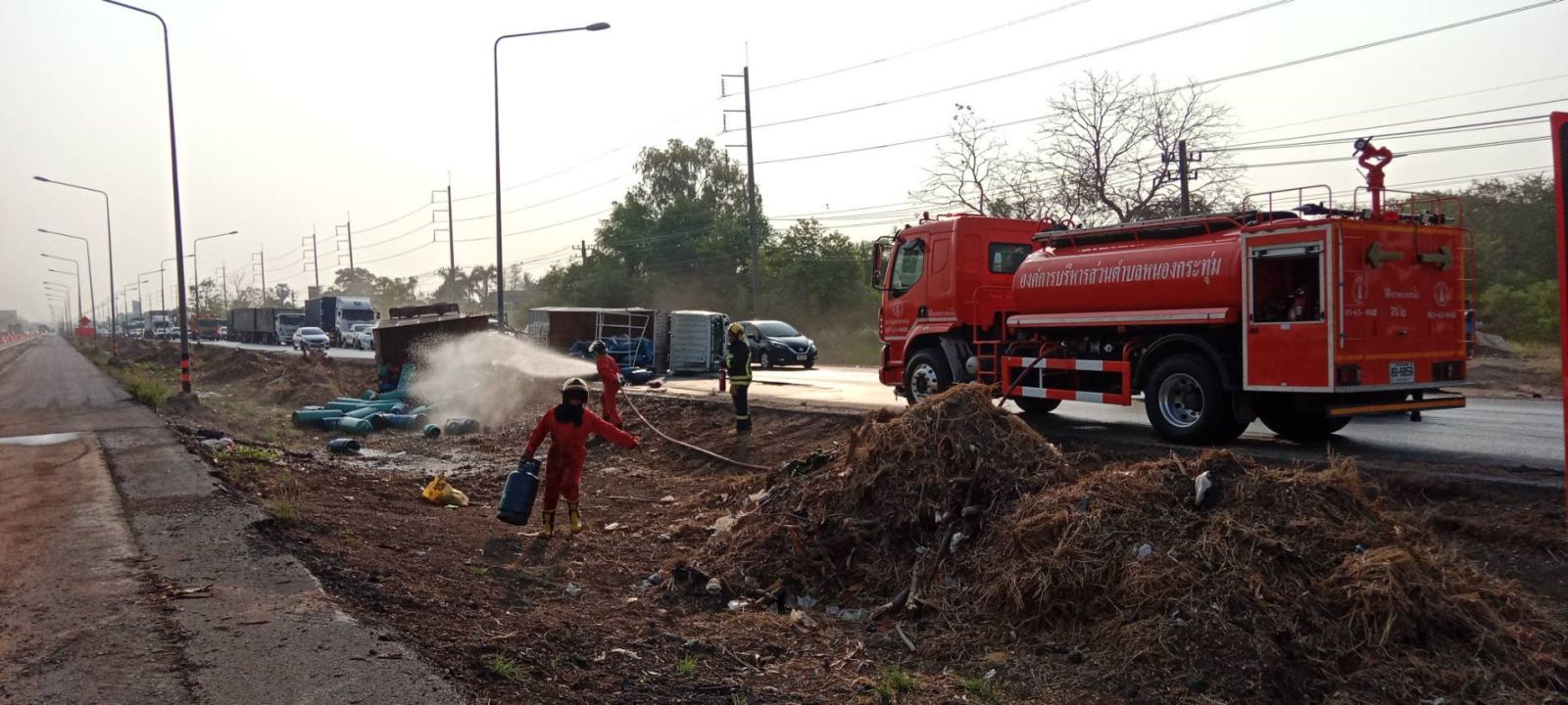 รถ 6 ล้อบรรทุกถังแก๊สพลิกคว่ำมีแก๊สรั่วไหล