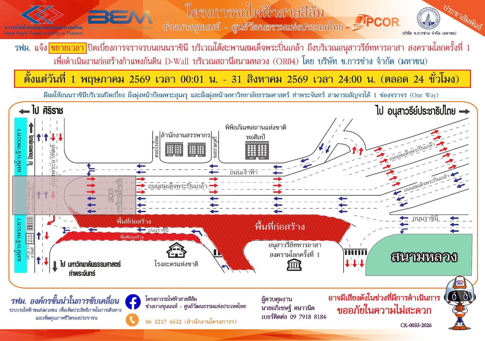 การรถไฟฟ้าขนส่งมวลชนแห่งประเทศไทย (รฟม.) แจ้งว่า บริษัท ช.การช่าง จำกัด (มหาชน) ผู้รับจ้างออกแบบและก่อสร้างอุโมงค์ทางวิ่งและสถานีใต้ดิน โครงการรถไฟฟ้าสายสีส้ม ช่วงบางขุนนนท์ – ศูนย์วัฒนธรรมแห่งประเทศไทย มีความจำเป็นต้องขยายเวลาปิดเบี่ยงการจราจรบนถนนราชินี บริเวณใต้สะพานสมเด็จพระปิ่นเกล้า ถึงบริเวณอนุสาวรีย์ทหารอาสา สงครามโลกครั้งที่ 1 เพื่อดำเนินงานก่อสร้างกำแพงกันดิน D-Wall บริเวณสถานีสนามหลวง (OR04) ตั้งแต่วันที่ 1 พฤษภาคม 2569 เวลา 00:01 น. – 31 สิงหาคม 2569 เวลา 24:00 น.