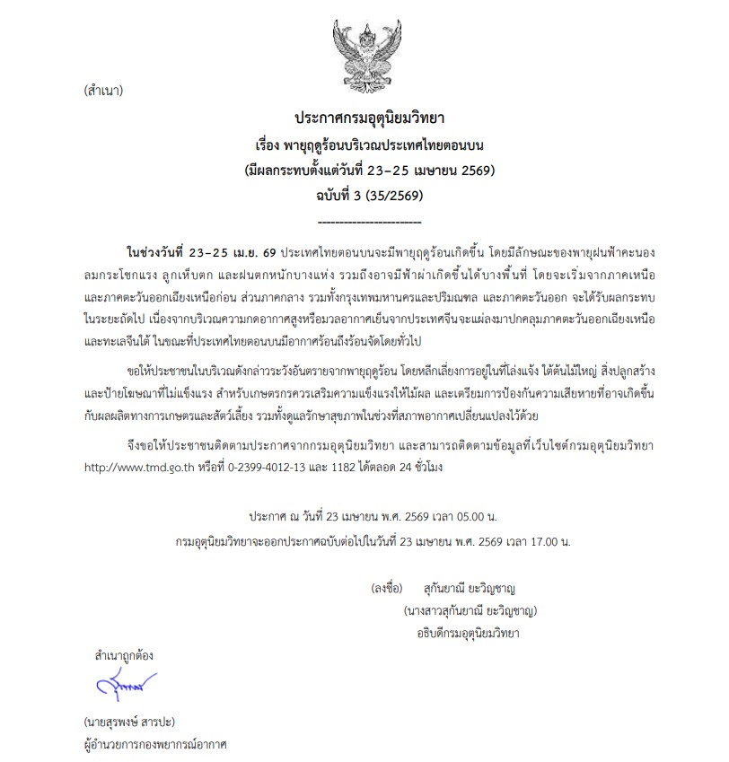ประกาศกรมอุตุนิยมวิทยา เรื่อง พายุฤดูร้อนบริเวณประเทศไทยตอนบน (มีผลกระทบตั้งแต่วันที่ 23–25 เมษายน 2569) ฉบับที่ 3