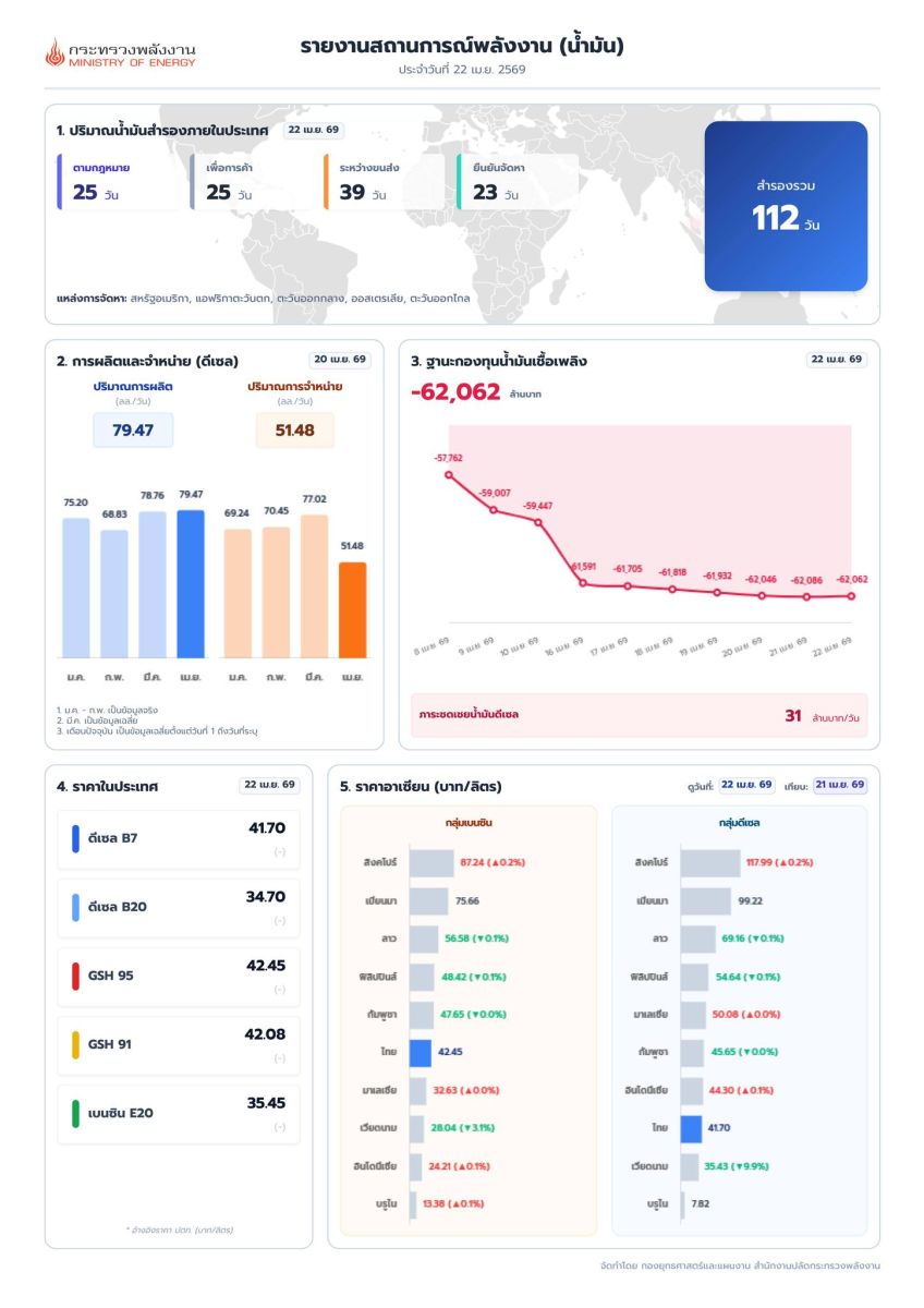 สำหรับสถานการณ์ราคาน้ำมันในขณะนี้ ราคาที่สิงคโปร์ มีการปรับตัวเพิ่มขึ้น โดยราคาน้ำมันดีเซลปรับตัวเพิ่มขึ้นถึง 3 บาทต่อลิตร ซึ่งจะเห็นว่าไทยยังไม่มีการปรับราคาน้ำมันขายปลีกหน้าปั๊ม ดังนั้นกระทรวงจะนำเงินดังกล่าวมาบริหารจัดการร่วมกัน เพื่อให้ราคาหน้าปั๊มอยู่ในระดับที่เหมาะสม โดยในเย็นวันนี้จะการประชุมคณะกรรมการบริหารกองทุนน้ำมันเชื้อเพลิงหรือกบน. เพื่อกำหนดราคาน้ำมันขายปลีกอีกครั้งแต่ทั้งนี้ จะต้องรอดูสถานการณ์ราคาน้ำมันในตลาดสิงคโปร์อ้างอิงด้วย