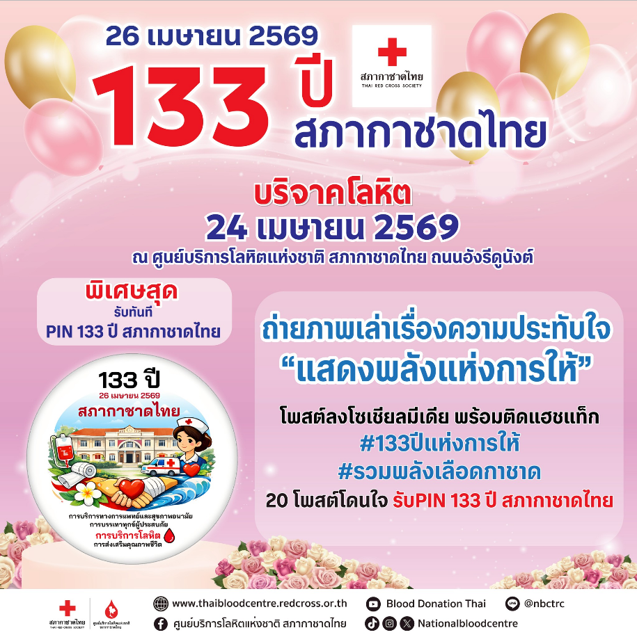 พิเศษ ! ผู้ที่บริจาคโลหิตในวันศุกร์ที่ 24 เมษายน 2569 ณ ศูนย์บริการโลหิตแห่งชาติ จะได้รับเข็มกลัด “133 ปี สภากาชาดไทย” เป็นที่ระลึก พร้อมเชิญชวนร่วมกิจกรรมโซเชียลมีเดีย โพสต์ภาพเล่าเรื่องความประทับใจ “แสดงพลังแห่งการให้” ผ่านโซเชียลมีเดีย เช็กอินสถานที่บริจาคโลหิต ตั้งค่าเป็นสาธารณะ ติดแฮชแท็ก #133ปีแห่งการให้ #รวมพลังเลือดกาชาด เพื่อร่วมสร้างกระแสการบริจาคโลหิตต่อชีวิตเพื่อนมนุษย์ โดย 20 โพสต์โดนใจ ลุ้นรับเข็มกลัด 133 ปี สภากาชาดไทย เป็นที่ระลึก