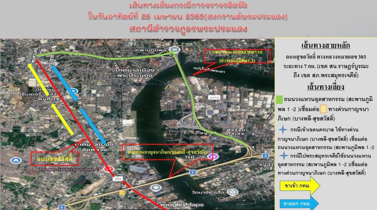 สถานีตำรวจภูธรพระประแดง สมุทรปราการ พิจารณาปิดจุดกลับรถ ถ.สุขสวัสดิ์ สงกรานต์พระประแดง ในวันอาทิตย์ ที่ 26 เมษายน 2569