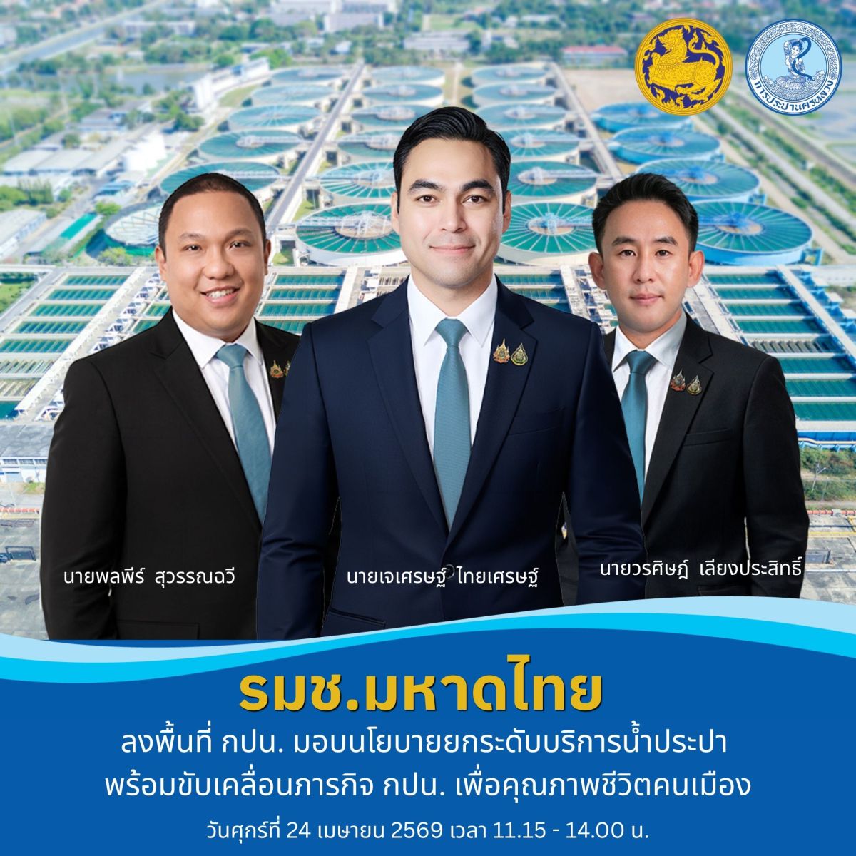 การประปานครหลวง (กปน.) แจ้งกำหนดการเตรียมให้การต้อนรับ นายเจเศรษฐ์ ไทยเศรษฐ์ รัฐมนตรีช่วยว่าการกระทรวงมหาดไทย (มท.3) นายพลพีร์ สุวรรณฉวี รัฐมนตรีช่วยว่าการกระทรวงมหาดไทย (มท.2) นายวรศิษฎ์ เลียงประสิทธิ์ รัฐมนตรีช่วยว่าการกระทรวงมหาดไทย (มท.4) พร้อมทั้งคณะผู้บริหารระดับสูง กระทรวงมหาดไทย ลงพื้นที่ตรวจเยี่ยมและมอบนโยบายการดำเนินงาน ณ สำนักงานใหญ่ การประปานครหลวง ในวันที่ 24 เมษายน 2569 เวลา 11.30 น. เพื่อกำกับติดตามการดำเนินงานด้านการผลิตและให้บริการน้ำประปาให้มีประสิทธิภาพ สอดคล้องกับนโยบายภาครัฐที่มุ่ง “บำบัดทุกข์ บำรุงสุข” และยกระดับคุณภาพชีวิตของคนเมือง