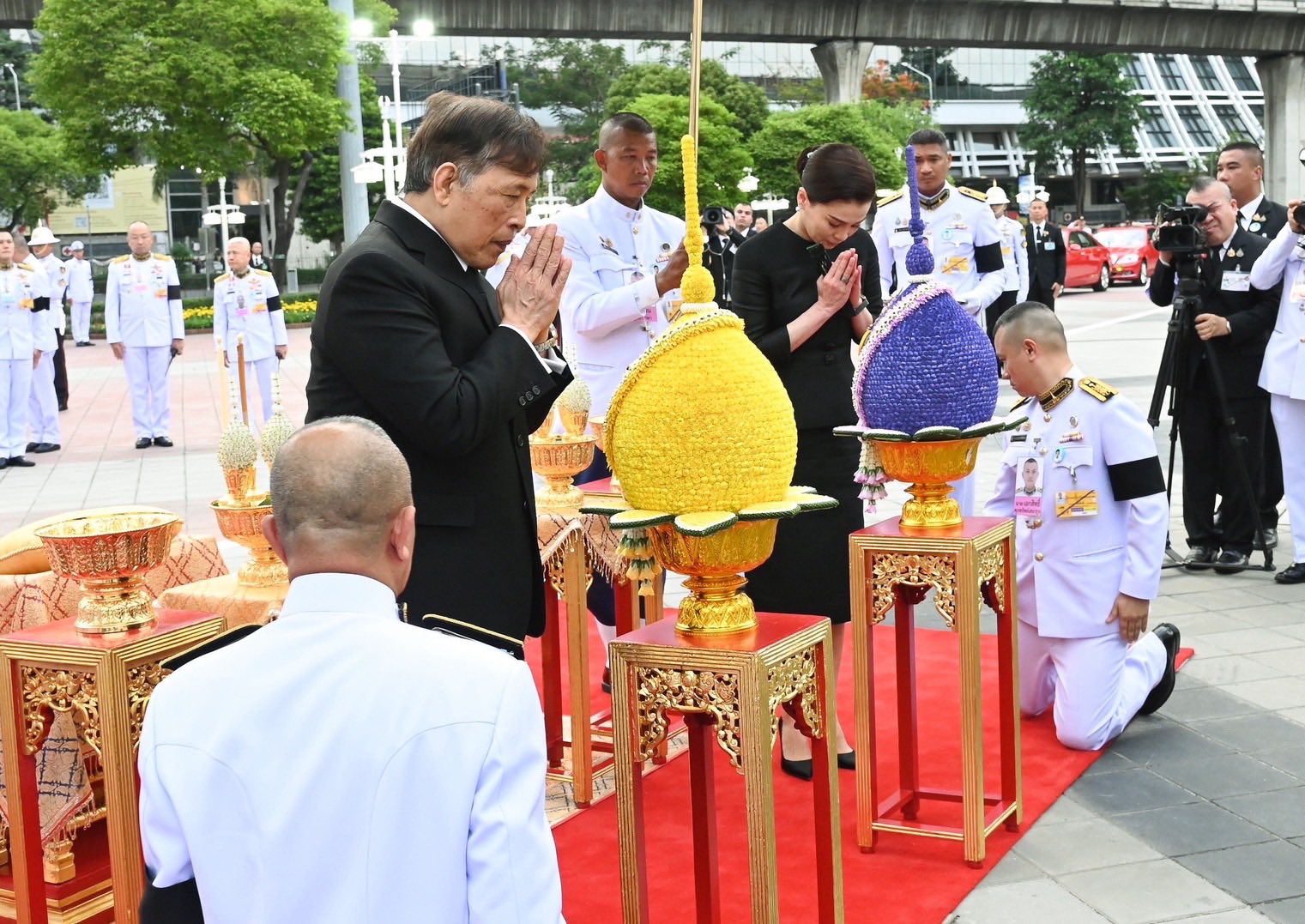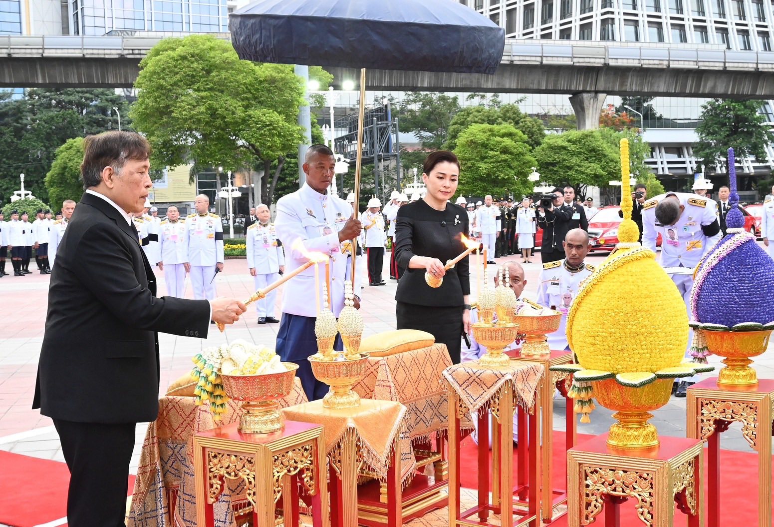 การนี้ ทรงวางพุ่มดอกไม้ ทรงจุดธูปเทียนเครื่องทองน้อยถวายราชสักการะ พระบรมราชานุสรณ์พระบาทสมเด็จพระปรเมนทรรามาธิบดี ศรีสินทรมหาวชิราวุธ พระมงกุฎเกล้าเจ้าอยู่หัว พระมหาธีรราชเจ้า แล้วประทับรถยนต์พระที่นั่ง เสด็จ ฯ ไปยังศาลาภิรมย์ภักดี