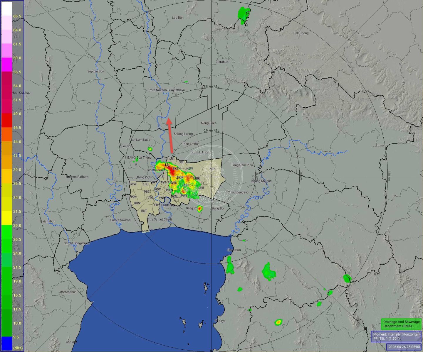 ศูนย์ป้องกันน้ำท่วม กรุงเทพมหานคร รายงาน วันที่ 26 เมษายน 2569 เวลา 15.20 น. ฝนเล็กน้อยถึงปานกลางเขตห้วยขวาง จตุจักร หลักสี่ ลาดพร้าว บางเขน วังทองหลาง บางกะปิ บึงกุ่ม สะพานสูง คันนายาว คลองสามวา ลาดกระบัง มีนบุรี เคลื่อนตัวทิศเหนือ แนวโน้มคงที่ ฝนรวมสูงสุดเขตบางเขน 38.5 มม.