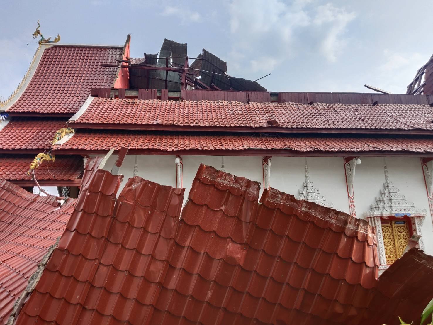 – หลังคาวิหารวัดท่ามะเกี๋ยงเหนือเสียหาย