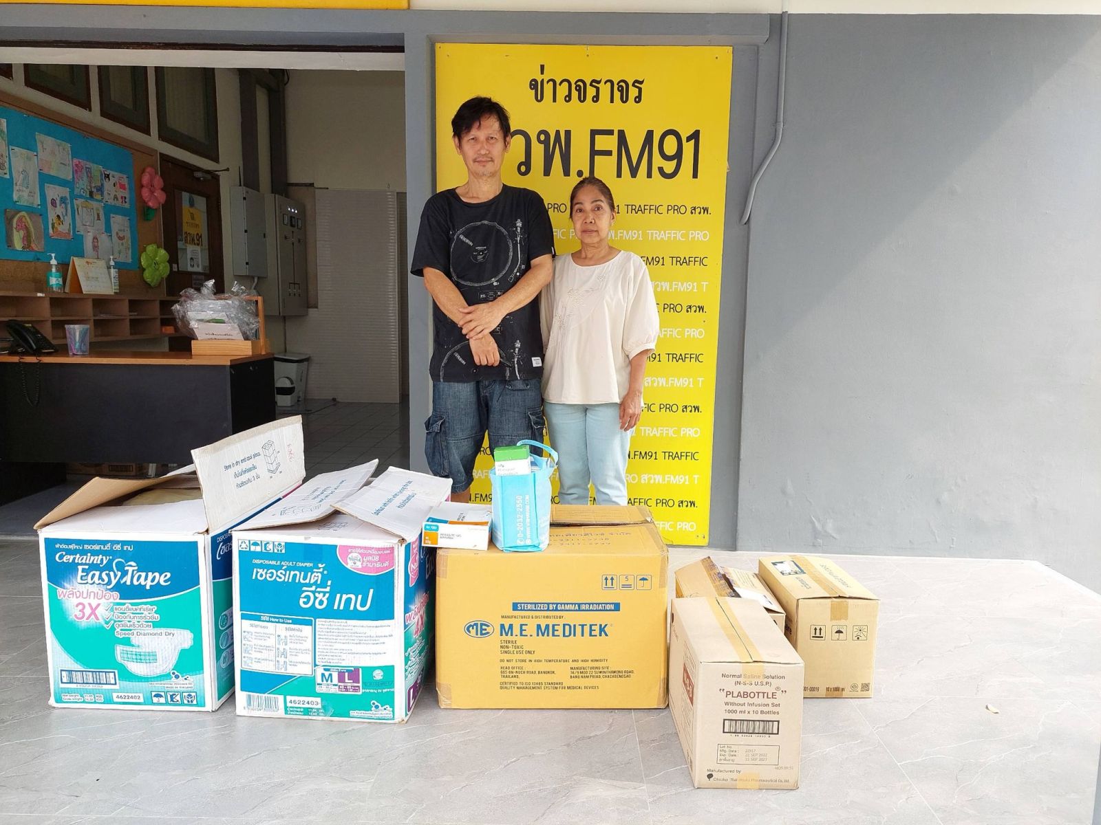 ที่สถานีวิทยุ สวพ.FM91 ในนาม คุณปัญญา และคุณกฤษพงษ์ ศิริสัมพันธ์ และครอบครัวศิริสัมพันธ์ บริจาคถุงอาหาร สายดูดเสมหะ ผ้าก๊อซ น้ำเกลือ และอุปกรณ์สำหรับผู้ป่วยที่มีแผลกดทับ