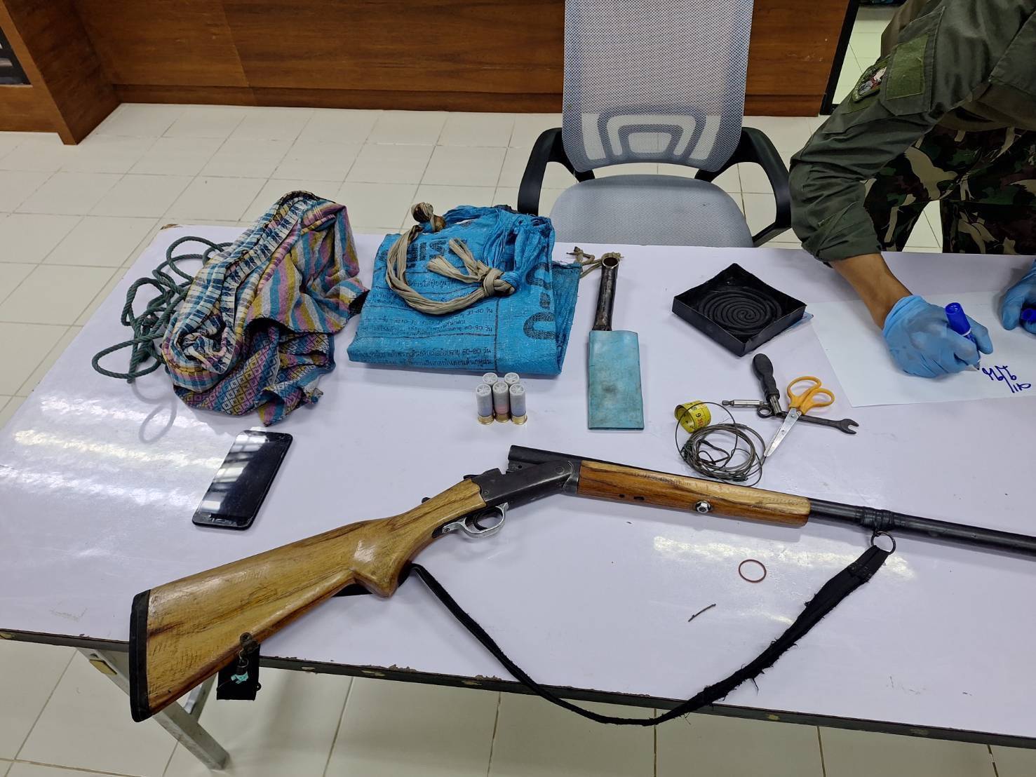 นอกจากนี้ ยังพบของกลางสำคัญ อาทิ บ่วงสลิงสำหรับดักสัตว์ เส้นตะกั่วหลอม มีดพก และอุปกรณ์พักแรม รวมทั้งสิ้น 13 รายการ จึงควบคุมตัวพร้อมยึดรถจักรยานยนต์ไว้เป็นหลักฐาน