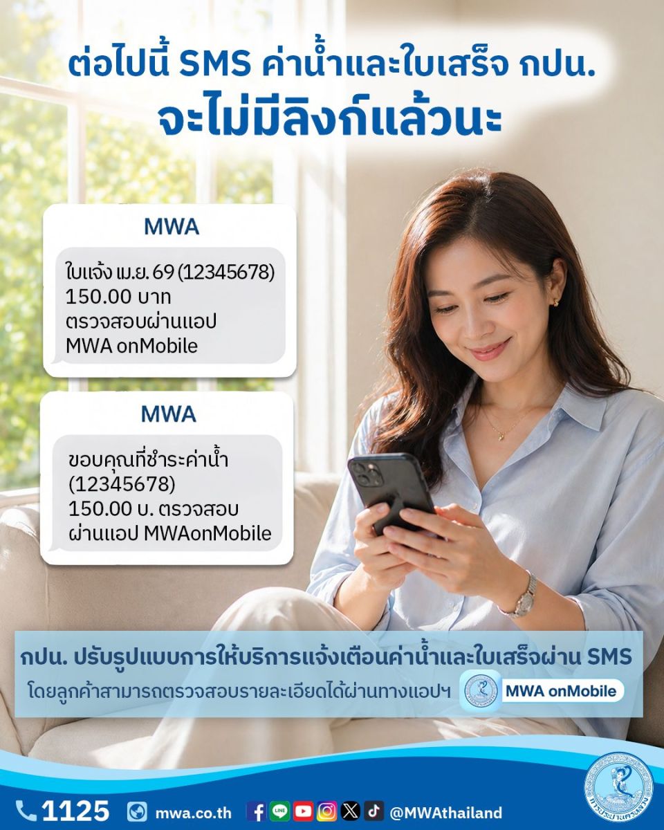 กปน. จะเริ่มปรับเปลี่ยนรูปแบบการส่ง SMS หรือข้อความสั้น ตั้งแต่วันที่ 1 พฤษภาคม 2569 เป็นต้นไป จากเดิมระบุว่า “ใบแจ้ง/ใบเสร็จ เดือน/ปี ทะเบียน xxxxxxxx https://ebill.mwa.co.th/.....” เป็น “ใบแจ้งค่าน้ำ เดือน/ปี (xxxxxxxx) xxxxxx.xx บ. ตรวจสอบผ่านแอป MWA onMobile” หรือ “ขอบคุณที่ชำระค่าน้ำ (xxxxxxxx) xxxxxx.xx บ. ตรวจสอบผ่านแอป MWA onMobile” โดยลูกค้าสามารถตรวจสอบและชำระค่าน้ำประปาด้วยตนเอง ผ่านแอปพลิเคชัน MWA onMobile ได้ตลอดเวลา