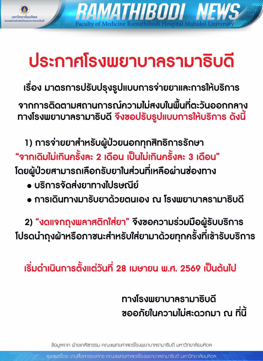 ประกาศโรงพยาบาลรามาธิบดี เรื่อง มาตรการปรับปรุงรูปแบบการจ่ายยาและการให้บริการ เริ่ม 28 เม.ย.นี้