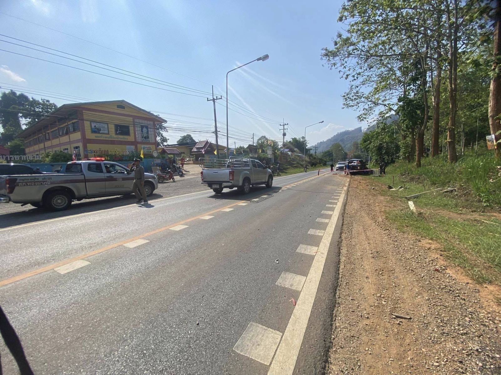 ที่เกิดเหตุ พบรถยนต์กระบะ โตโยต้า วีโก้ สีดำ สภาพด้านหน้าพังเสียหายจากการชนอย่างแรง ตรวจสอบบริเวณใต้ท้องรถ พบว่ามีร่างผู้บาดเจ็บ 1 ราย ทราบต่อมา เป็นชายไทย อายุประมาณ 65 ปี อดีตผู้ช่วยผู้ใหญ่บ้านหมู่ 2 นอนแน่นิ่งไม่รู้สึกตัว สภาพถูกรถกระบะทับติดอยู่กับซากรถจักรยานยนต์พ่วงข้าง (ซาเล้ง) ที่พังยับเยินอยู่ใต้ตัวรถ
