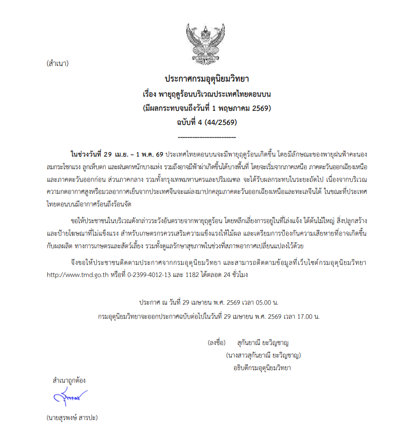 ประกาศกรมอุตุนิยมวิทยา เรื่อง พายุฤดูร้อนบริเวณประเทศไทยตอนบน (มีผลกระทบจนถึงวันที่ 1 พฤษภาคม 2569) ฉบับที่ 4 (44/2569)