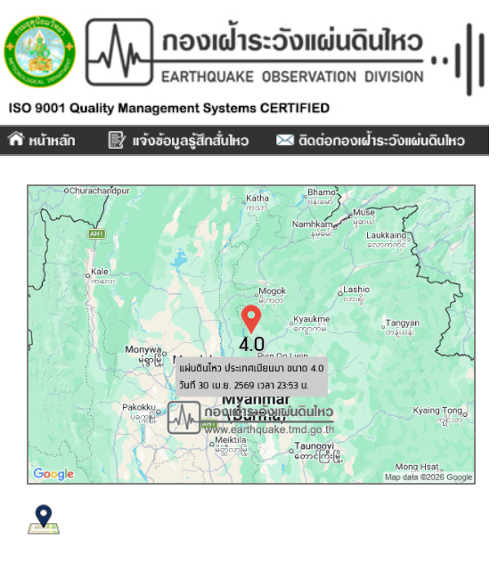เวลา 23.53 น. วันที่ 30 เมษายน 2569 กองเฝ้าระวังแผ่นดินไหว กรมอุตุนิยมวิทยา แจ้งเหตุแผ่นดินไหว ขนาด 4.0 ความลึก 10 กม. ภายในพื้นที่ของประเทศเมียนมา ศูนย์กลางห่างออกไปทางทิศตะวันตกเฉียงเหนือของ อ.ปางมะผ้า จ.แม่ฮ่องสอน ประมาณ 370 กม. ยังไม่มีรายงานผลกระทบต่อประเทศไทย