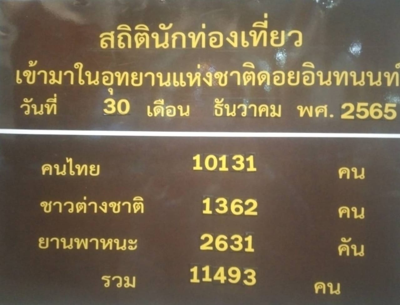 ส่วนสถิติจำนวนนักท่องเที่ยว ที่เดินทางมายังอุทยานแห่งชาติดอยอินทนนท์ เมื่อวานนี้ (30 ธ.ค. 2565) มีจำนวนทั้งสิ้น 11,493 คน แยกเป็นนักท่องเที่ยวชาวไทย จำนวน 10,131 คน และนักท่องเที่ยวชาวต่างประเทศ จำนวน 1,362 คน จำนวนยาพาหนะ 2,631 คัน