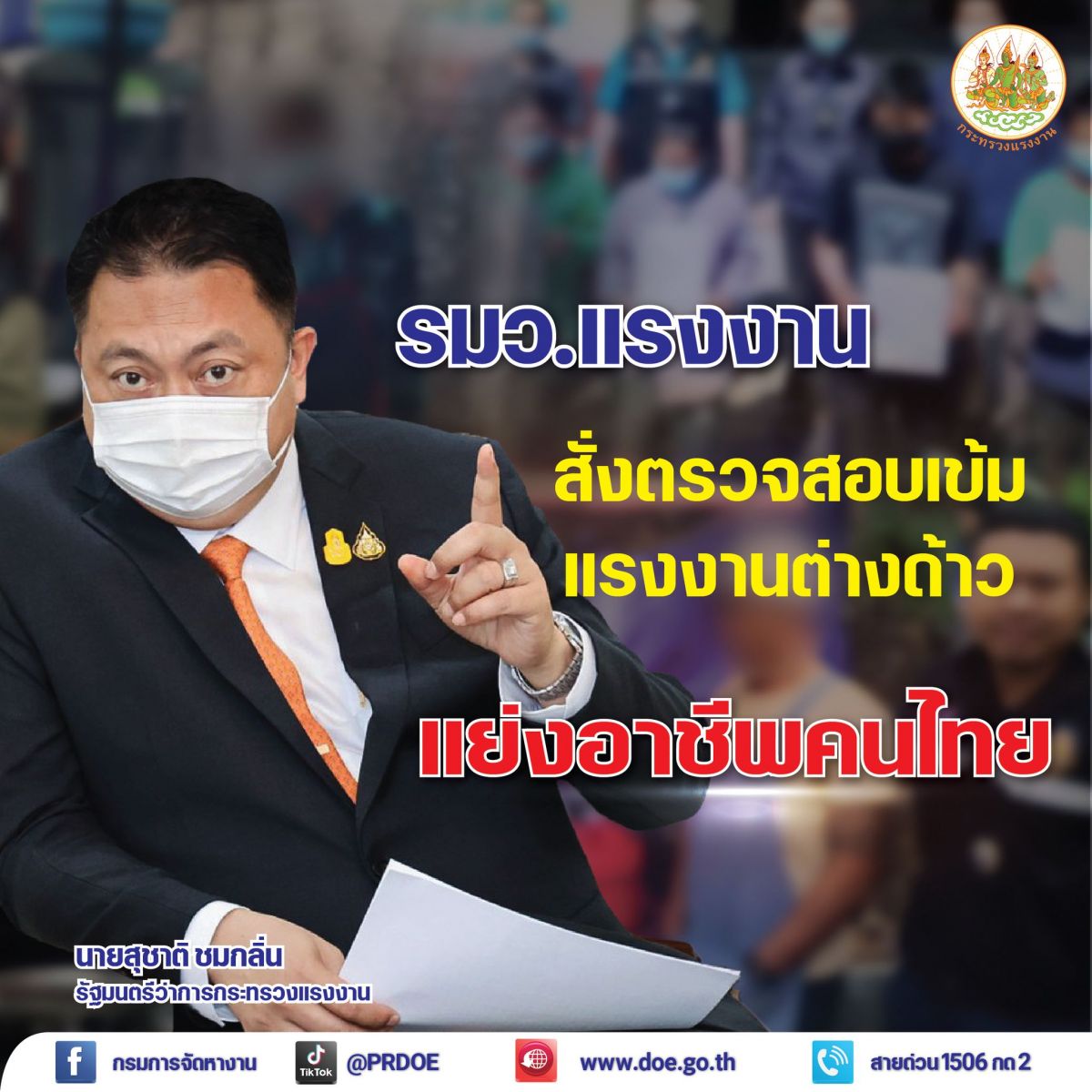รัฐมนตรีว่าการกระทรวงแรงงาน สั่งเข้ม กรมการจัดหางาน ตรวจสอบการทำงานแรงงานต่างด้าว พบฝ่าฝืนทำงานห้าม มีโทษทั้งนายจ้าง และลูกจ้าง โดยไม่มีข้อยกเว้น